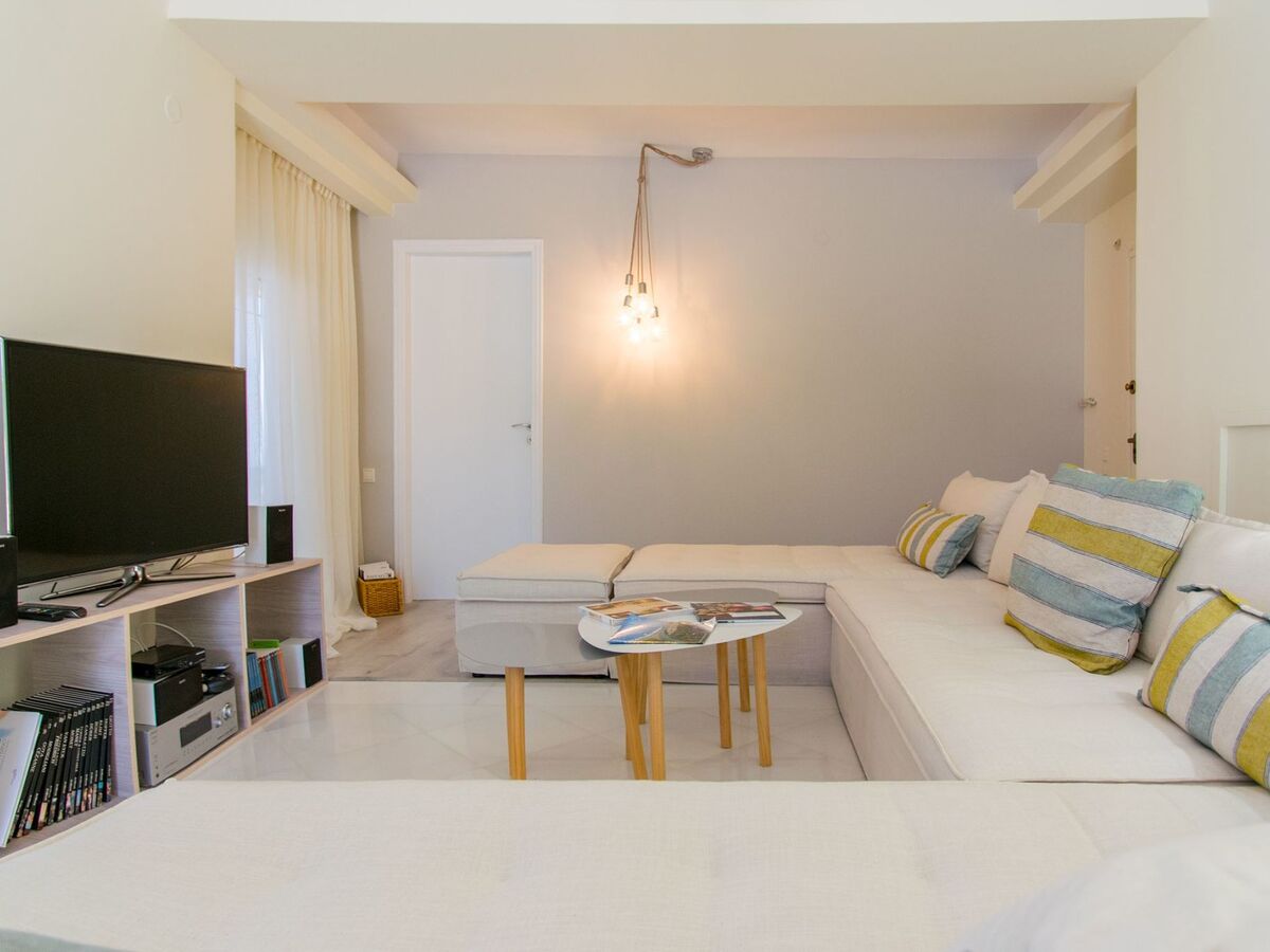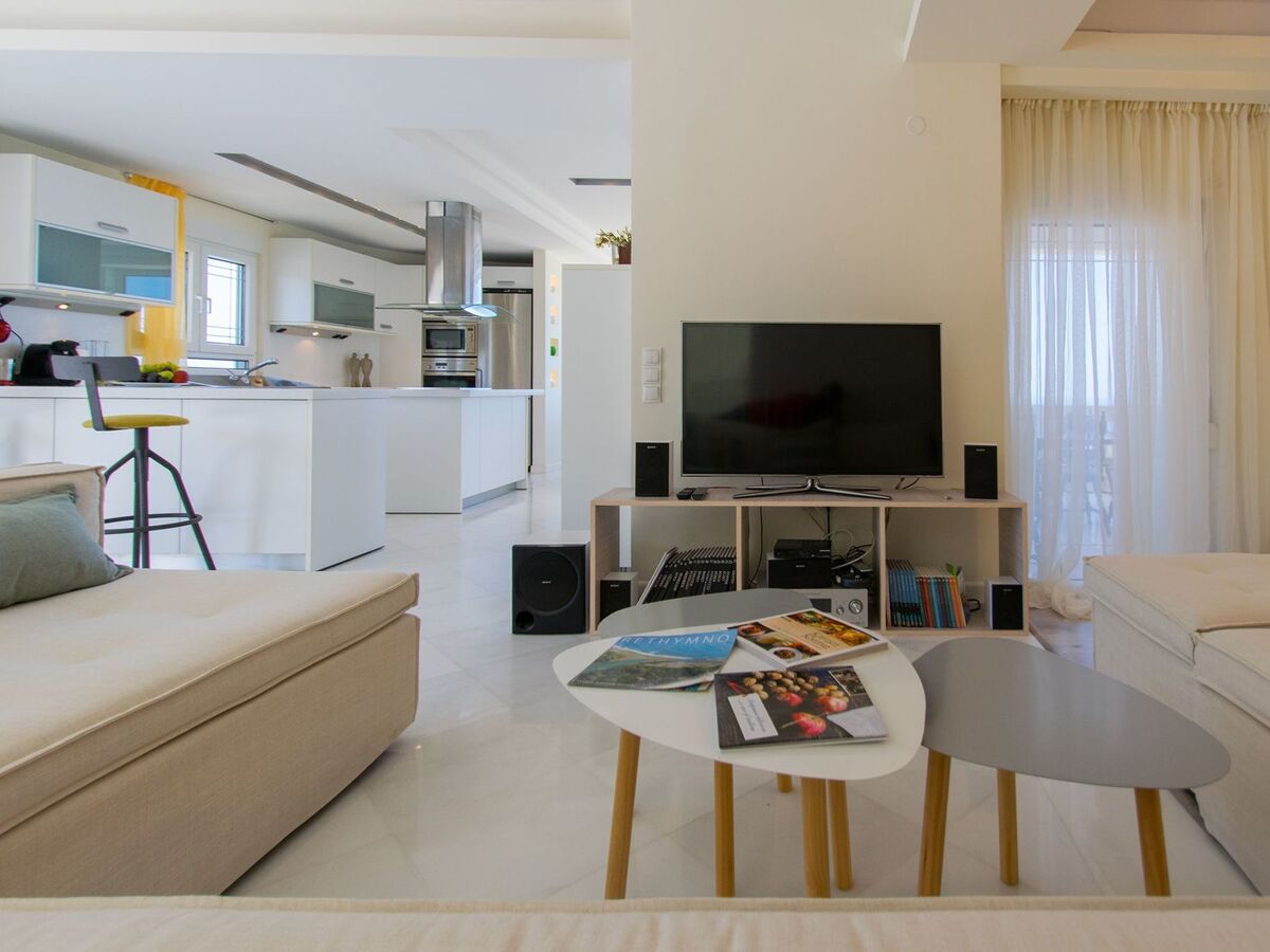 En entrant dans la villa, on se retrouve dans la cuisine et le salon, avec ses canapés confortables, une télévision à écran plat et le wifi, où l'on peut se reposer après une journée d'aventures en Crète.