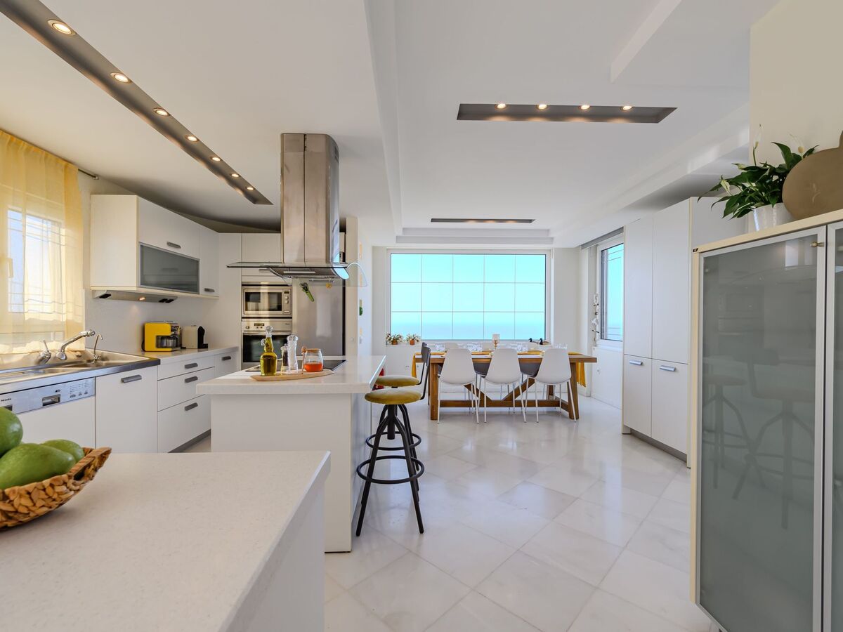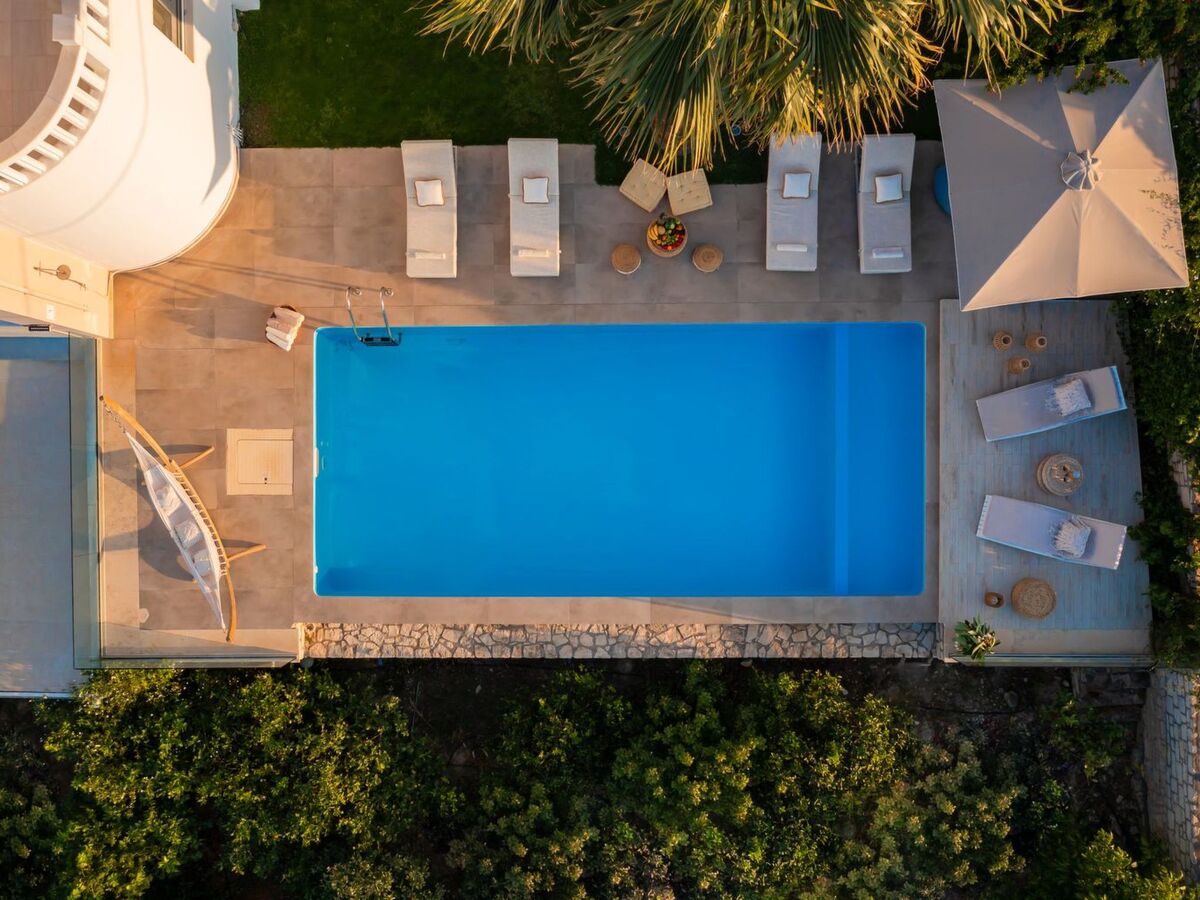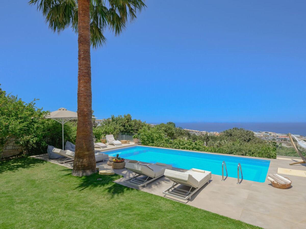 À l'extérieur de la villa, vous trouverez une piscine à débordement avec des vues panoramiques sur la mer et la vieille forteresse de Réthymnon, tout en buvant un cocktail et en vous asseyant sur les chaises longues à côté de la piscine.