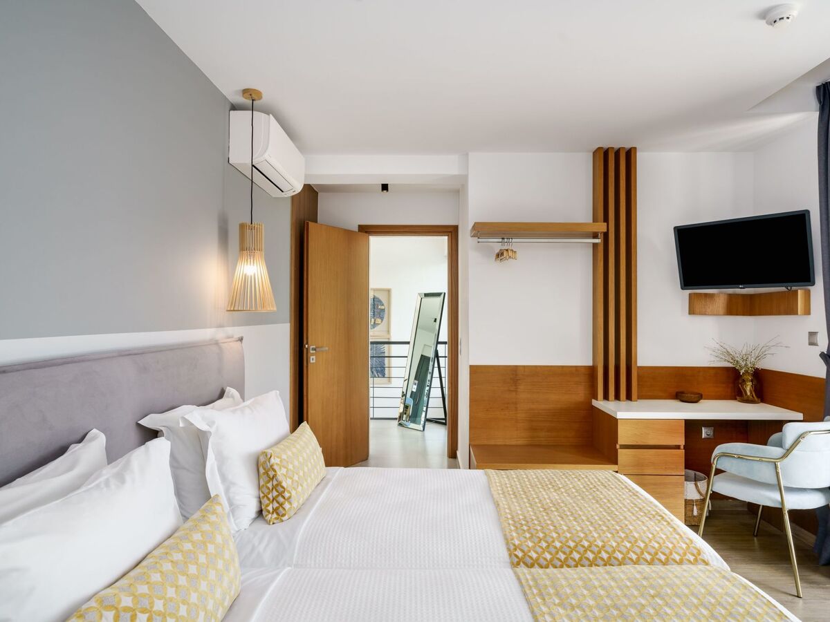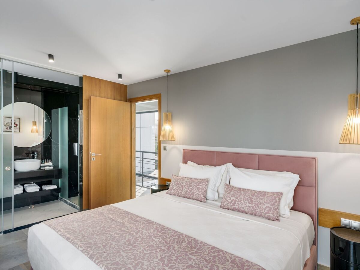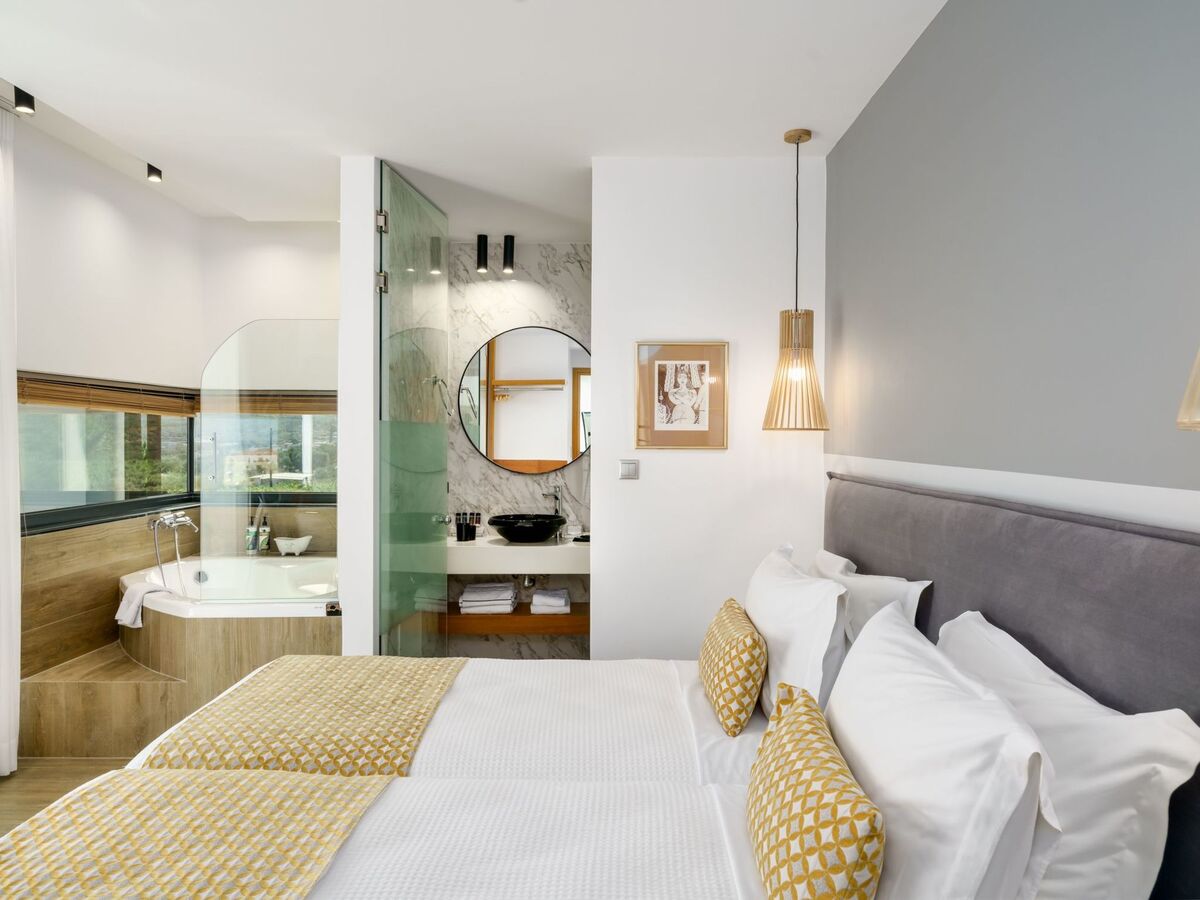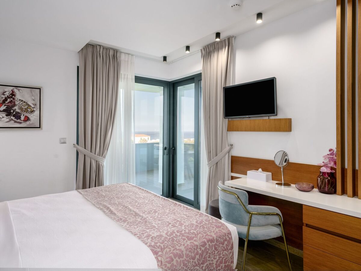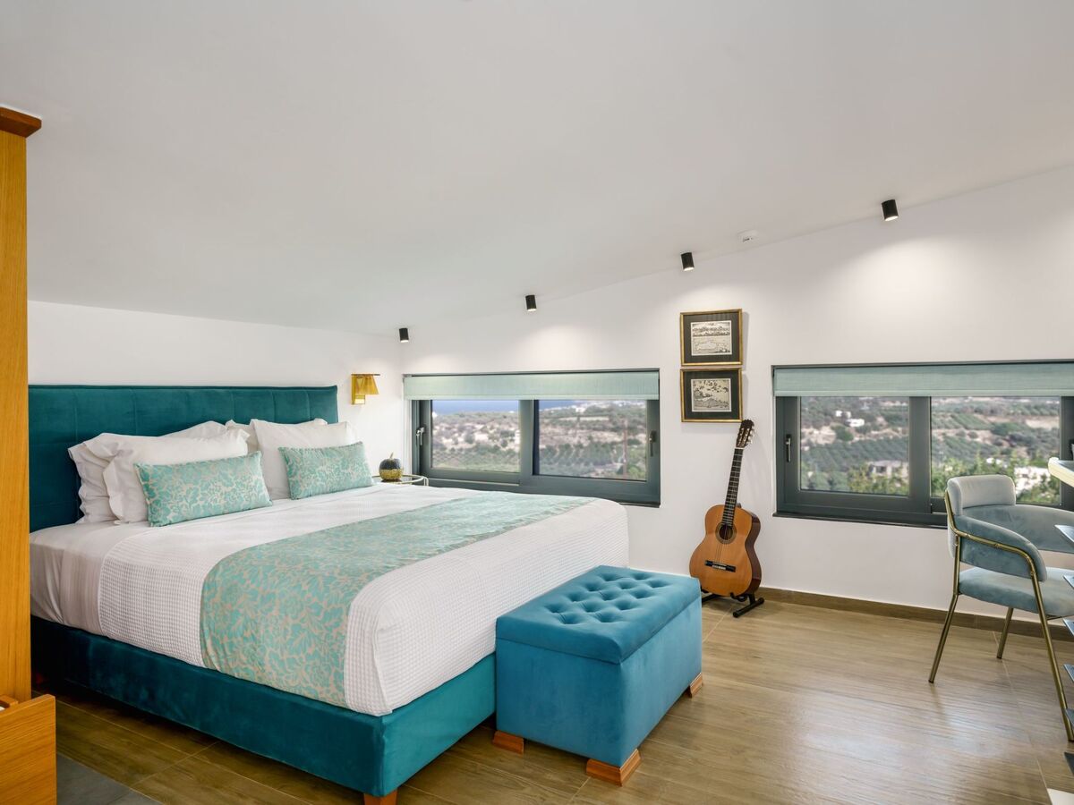 The attic bedroom offers a luxurious retreat with panoramic views of the Cretan Sea and Psiloritis Mountain.