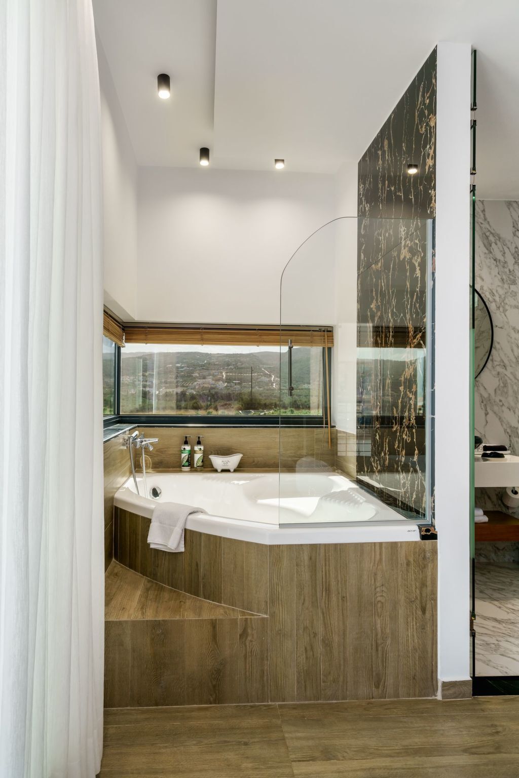 Perfect for families or groups, this modern 4-bedroom villa offers panoramic sea and mountain views, a private infinity pool, an indoor heated pool and luxurious amenities both inside and out.