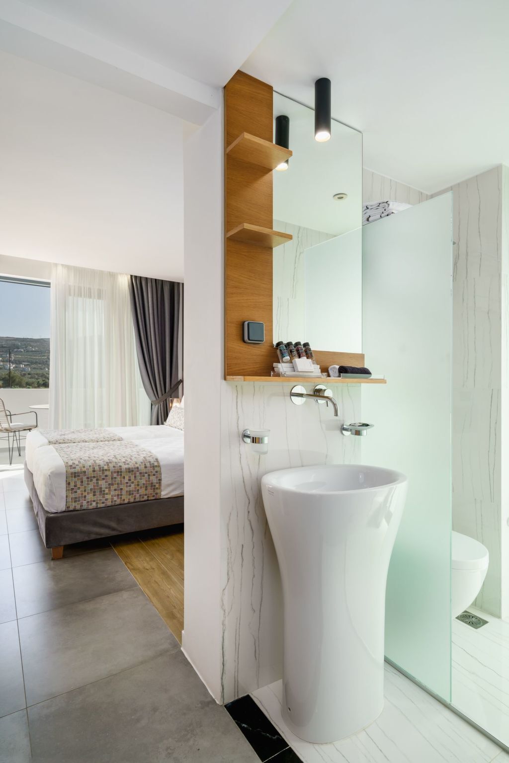 This special space includes a dedicated workspace (desk), an en-suite bathroom, and even a guitar for creative moments.