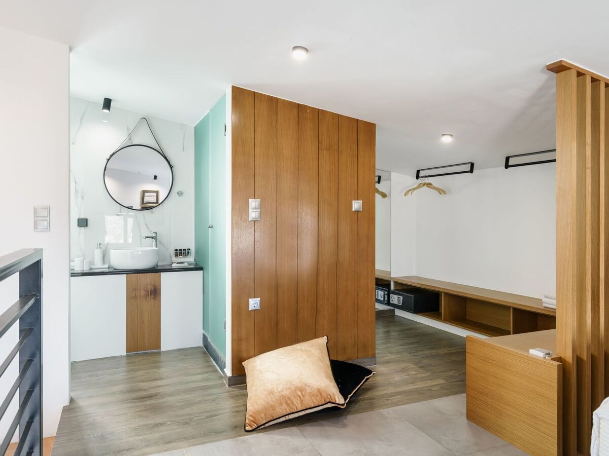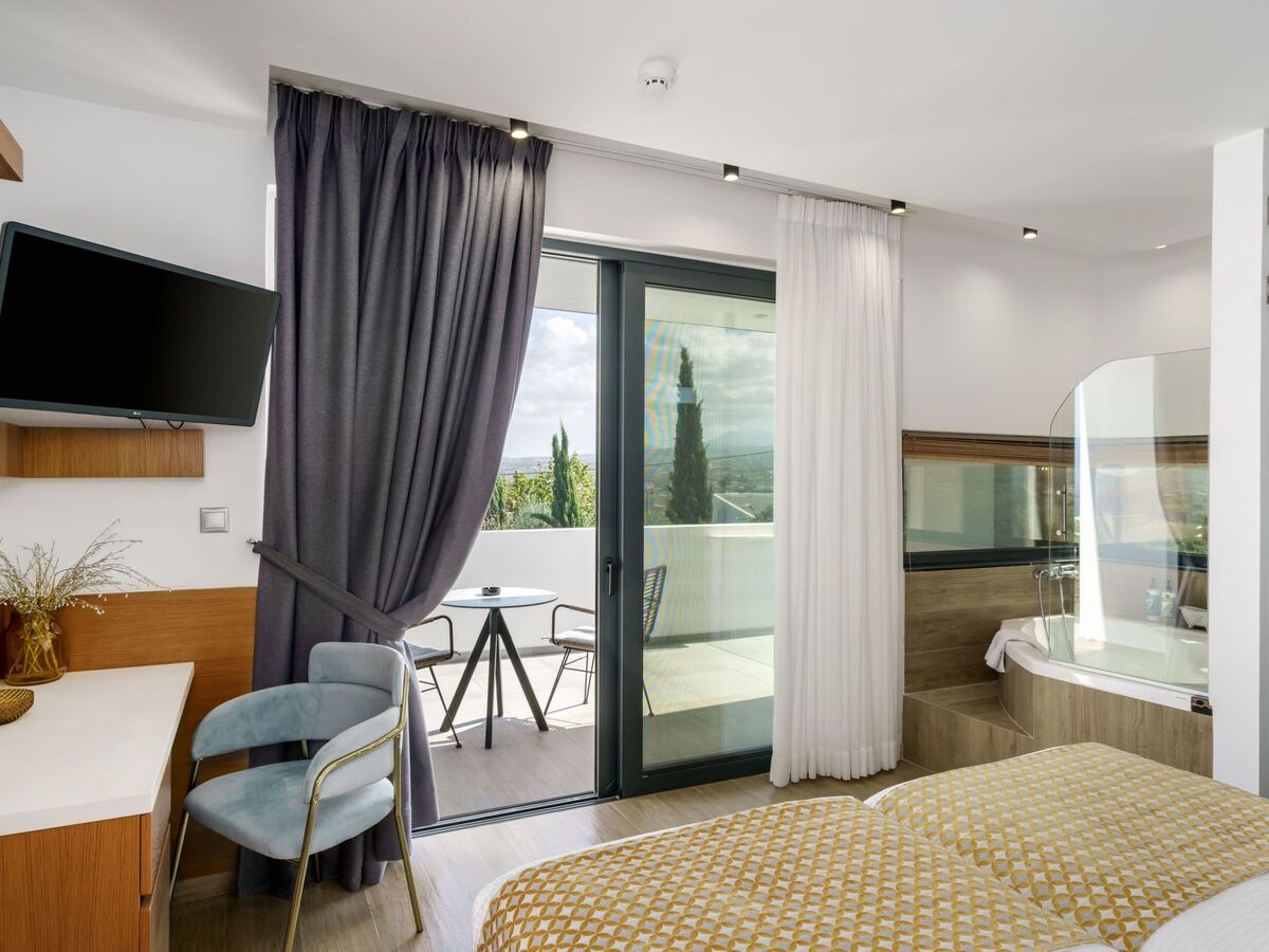 Shaded lounge areas and sunbeds invite you to unwind, and the comfortable outdoor seating area surrounding a modern fire pit is perfect for cosy evenings under the Cretan sky.