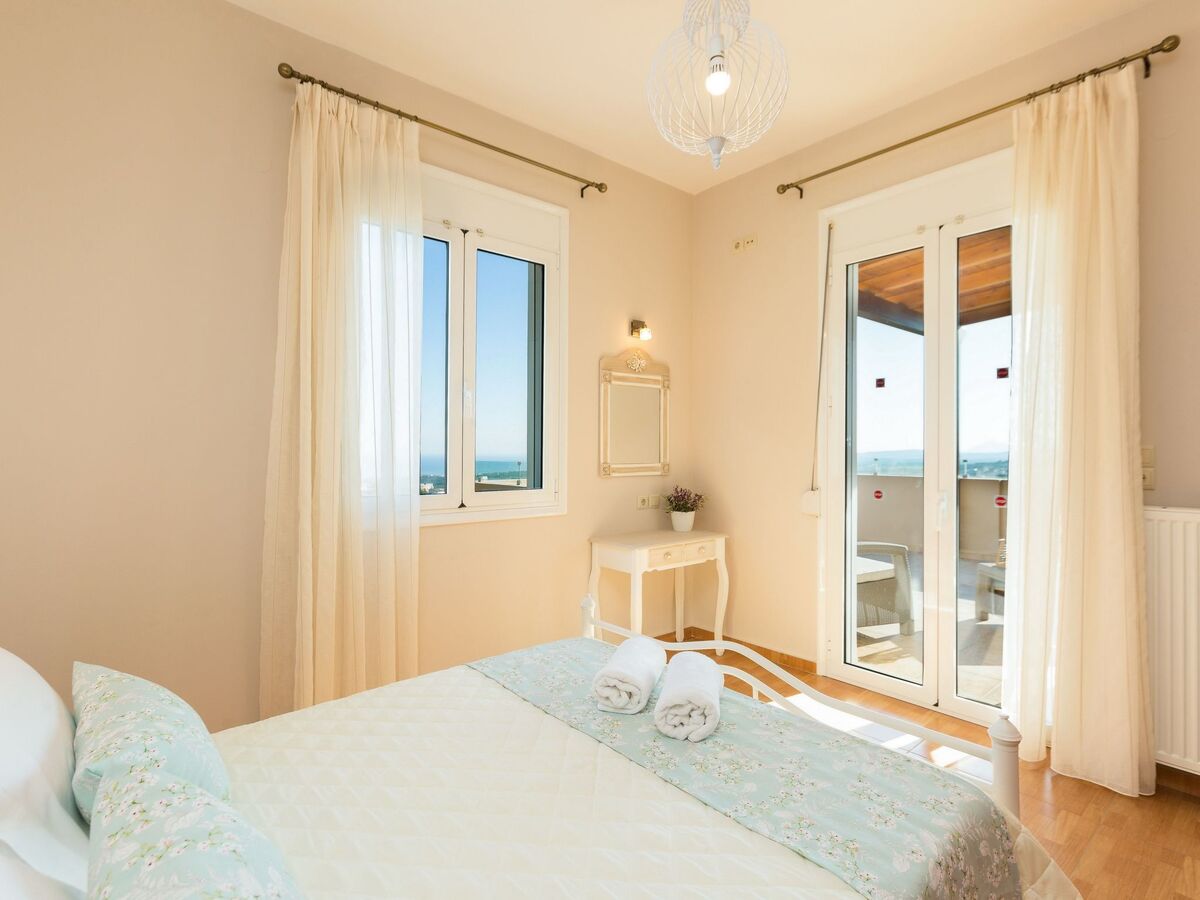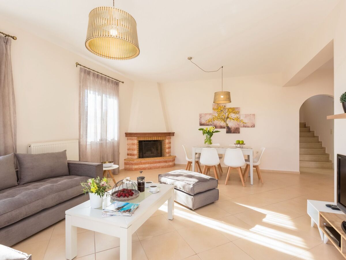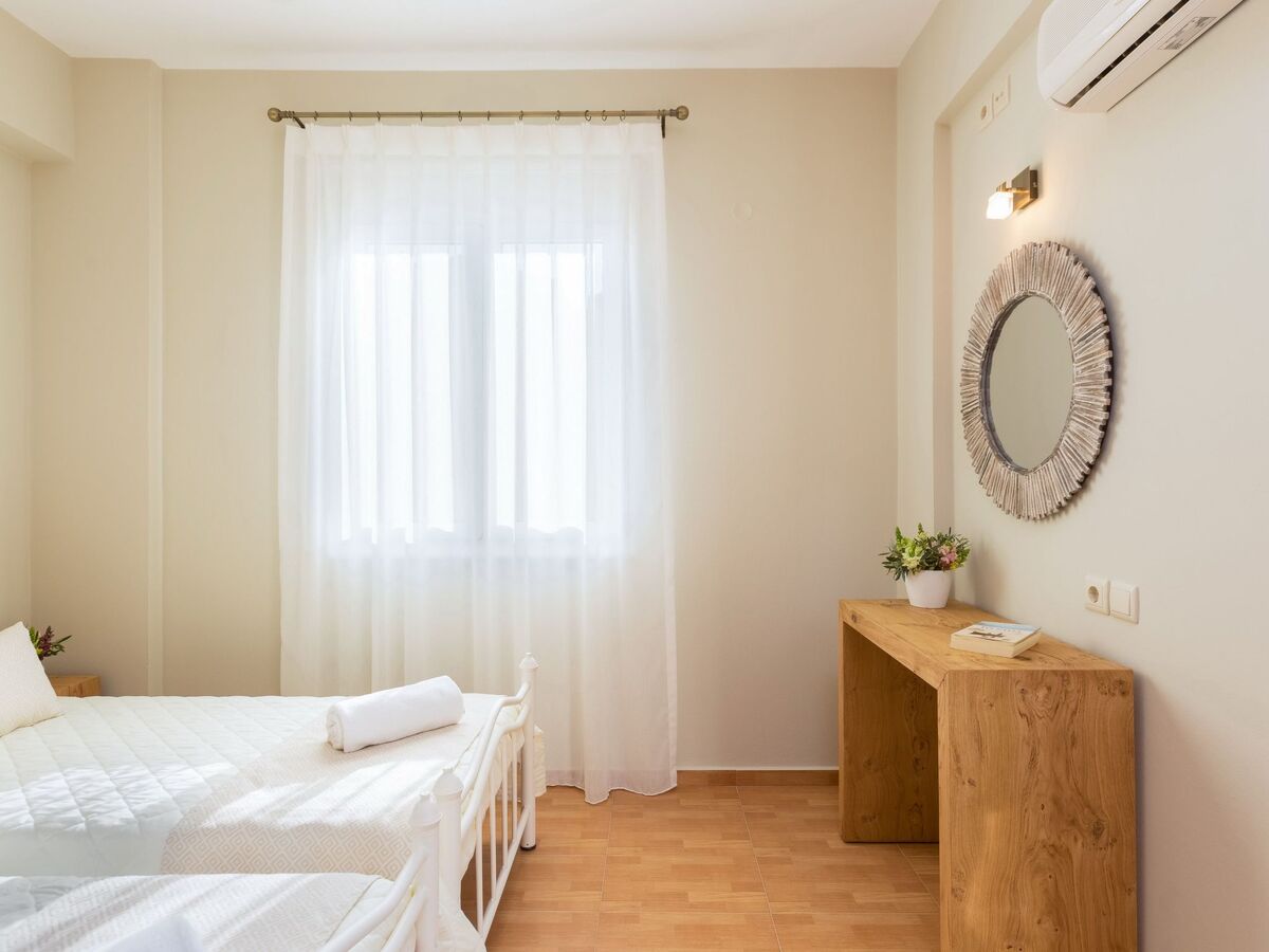 À quelques pas de là, vous trouverez la première chambre à deux lits et une salle de bains, avec accès à la terrasse de la pelouse, tandis que deux autres chambres et une salle de bains familiale se trouvent au niveau supérieur, chacune avec un balcon et de superbes vues.Ivi Villa dispose d'une belle terrasse de piscine isolée, idéale pour les petits-déjeuners ensoleillés d'été, avec vue sur la campagne crétoise et la mer.