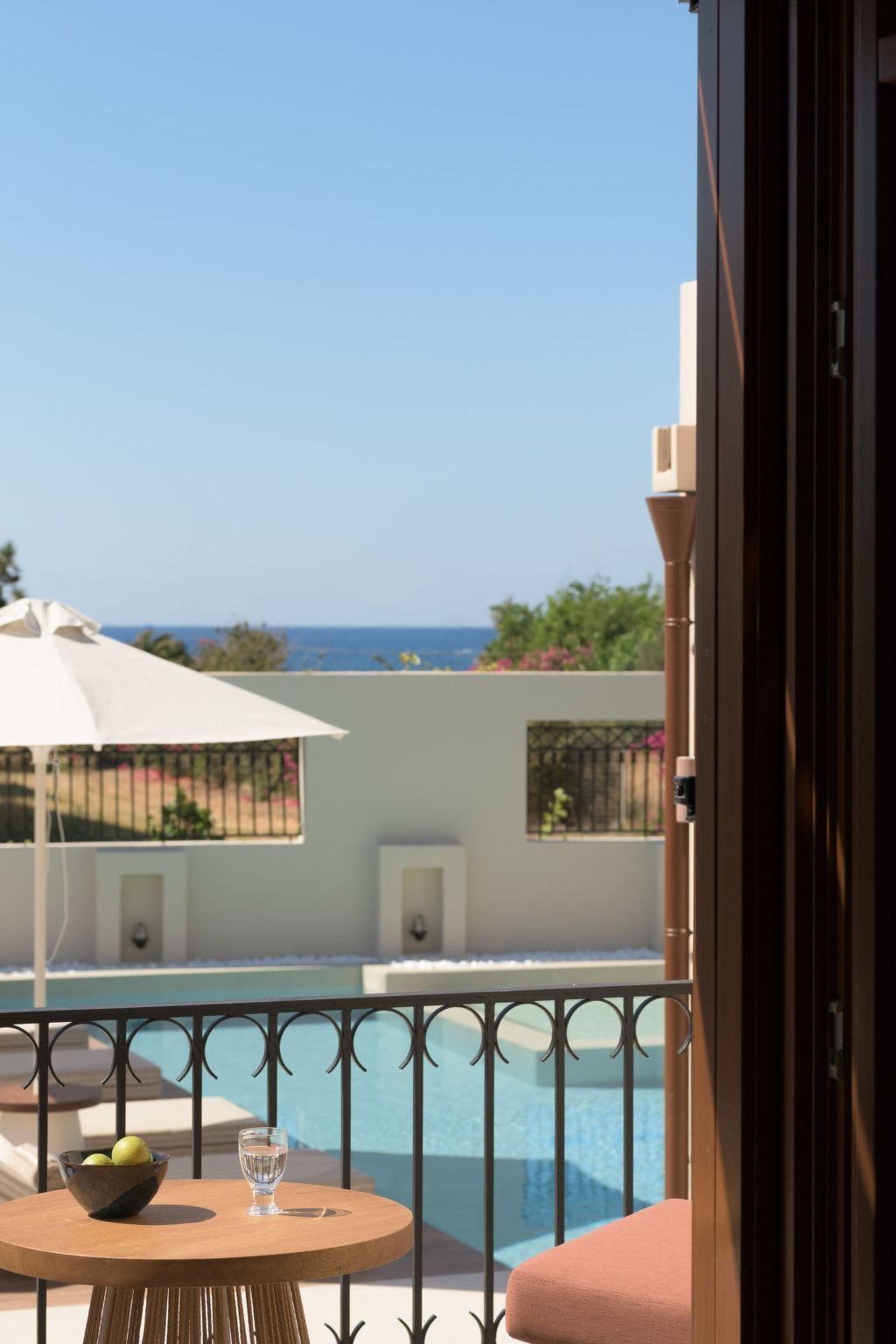 Doors open onto a balcony with a dedicated outdoor dining area, perfect for enjoying breakfast or evening meals while taking in the fresh air and views.