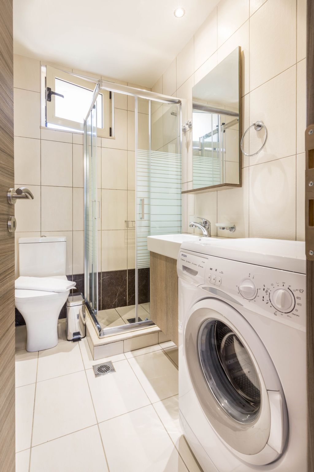 Dans la salle de bains, vous trouverez une douche agréable avec une cabine en verre, un sèche-cheveux, un ensemble complet de produits de toilette et des espaces de rangement pour ranger vos affaires.