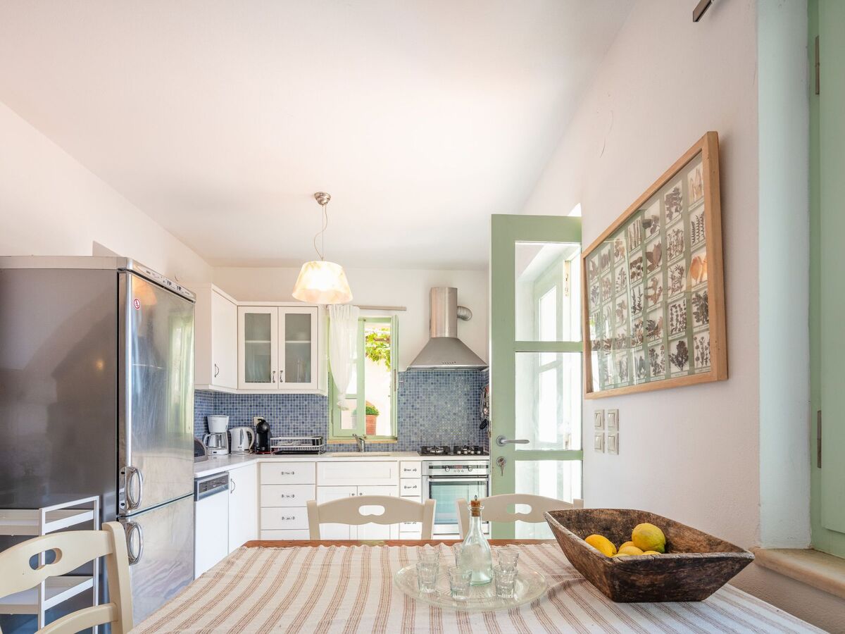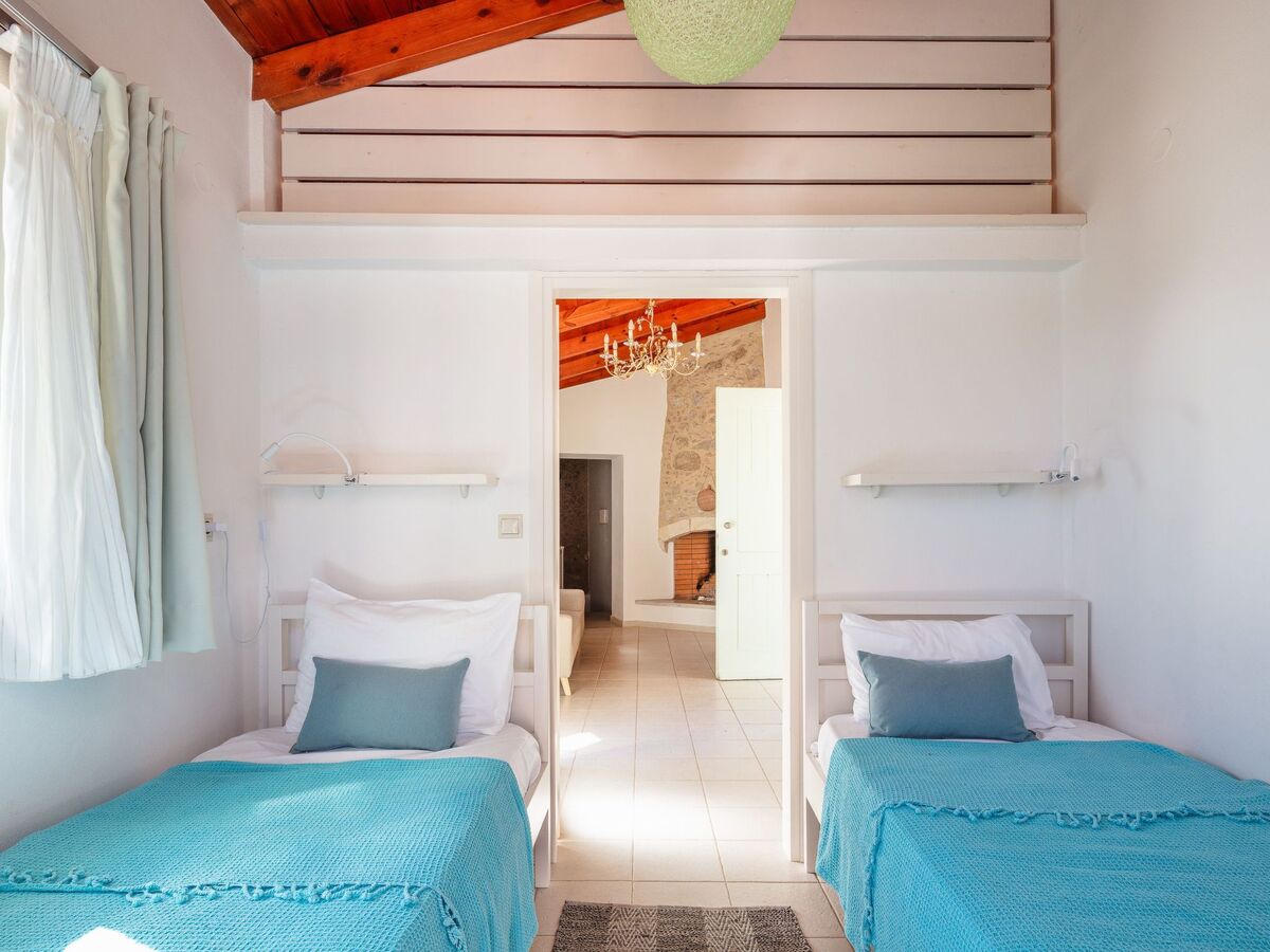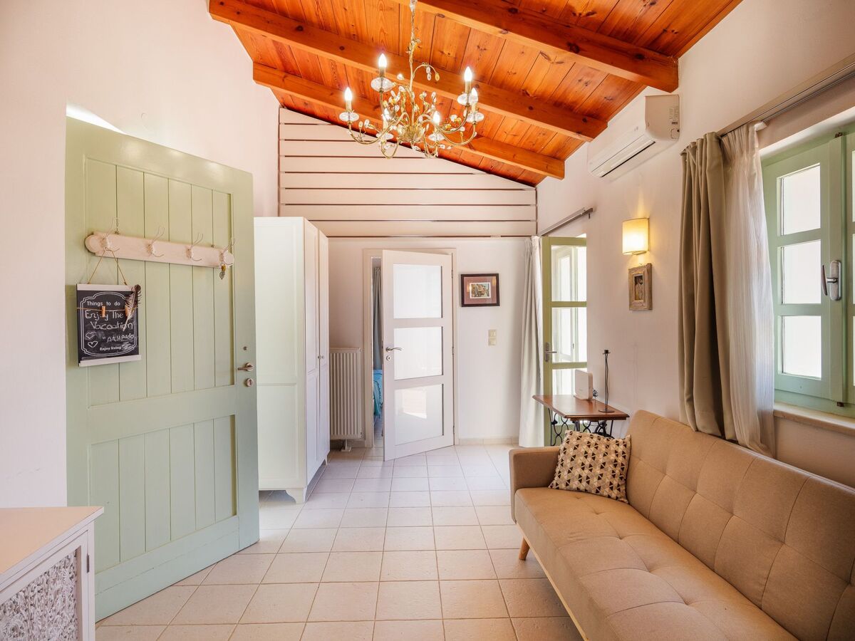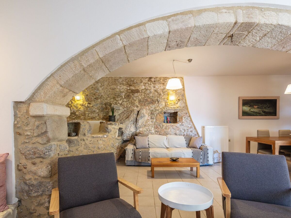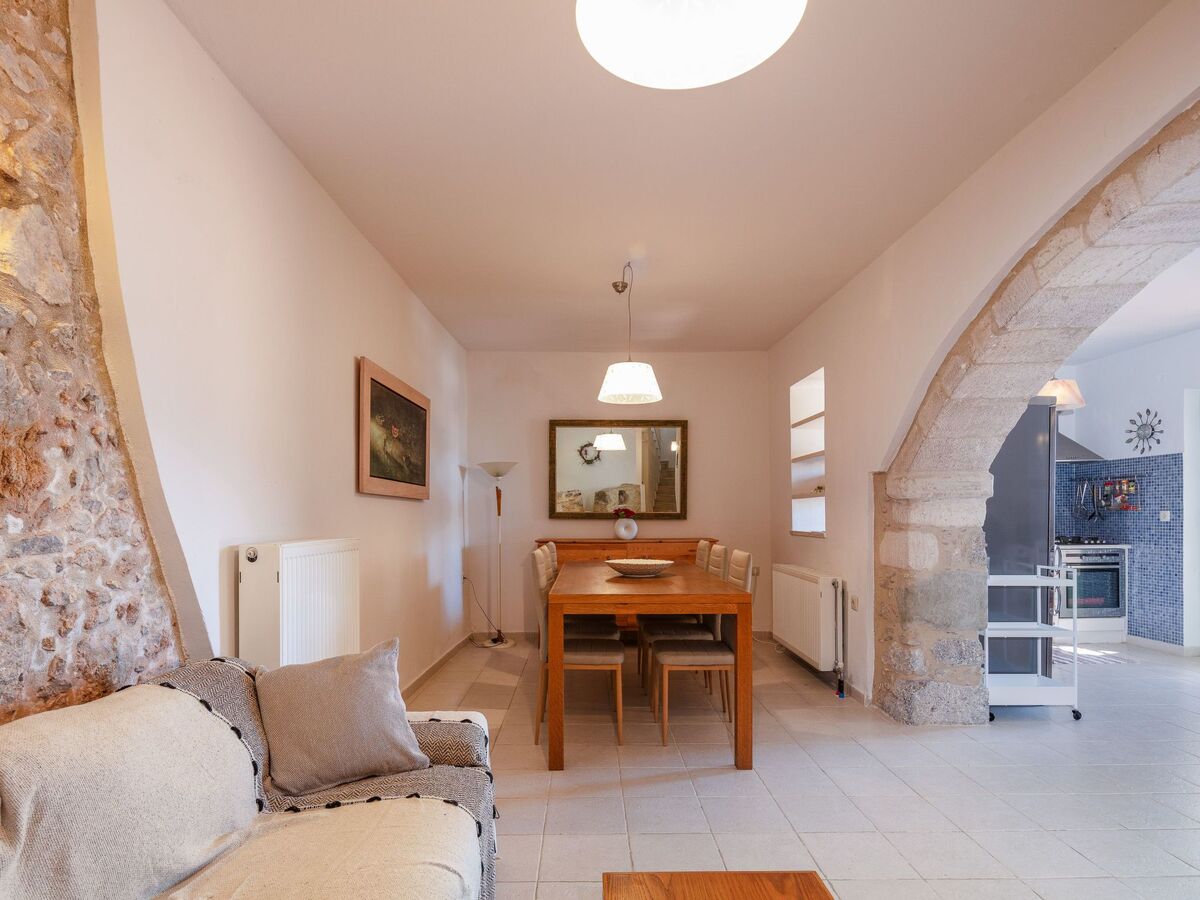 Le salon, chaleureux et accueillant, est doté d'une cheminée crétoise traditionnelle, de sièges confortables et d'une lumière naturelle abondante, ce qui est idéal pour passer des soirées tranquilles en famille ou entre amis.