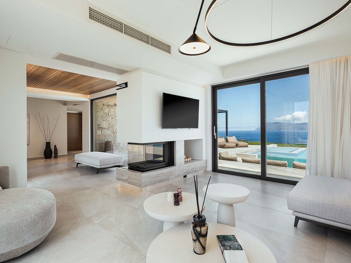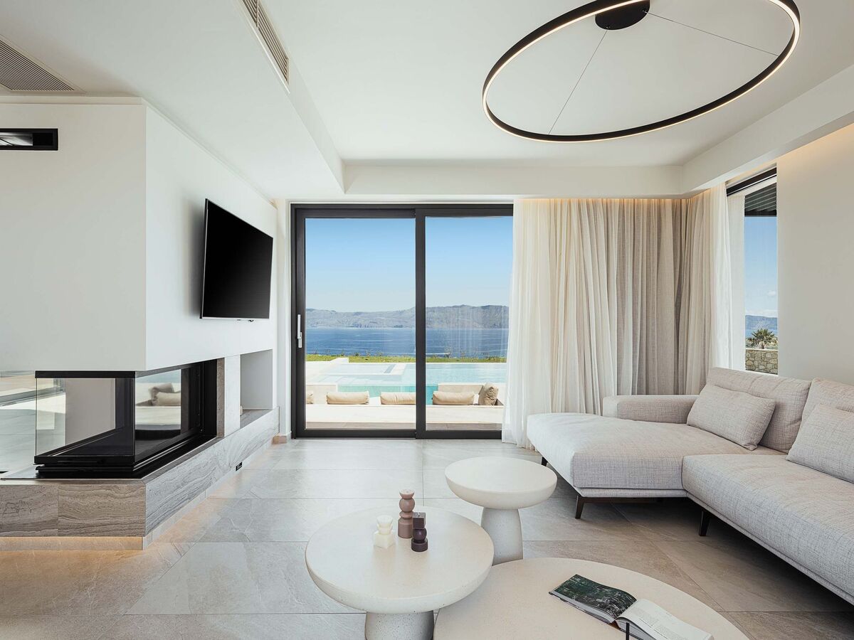 Living area with sofa, 55’’ satellite Smart TV, Bluetooth speaker, board games, fireplace, access to the pool terrace, sea view