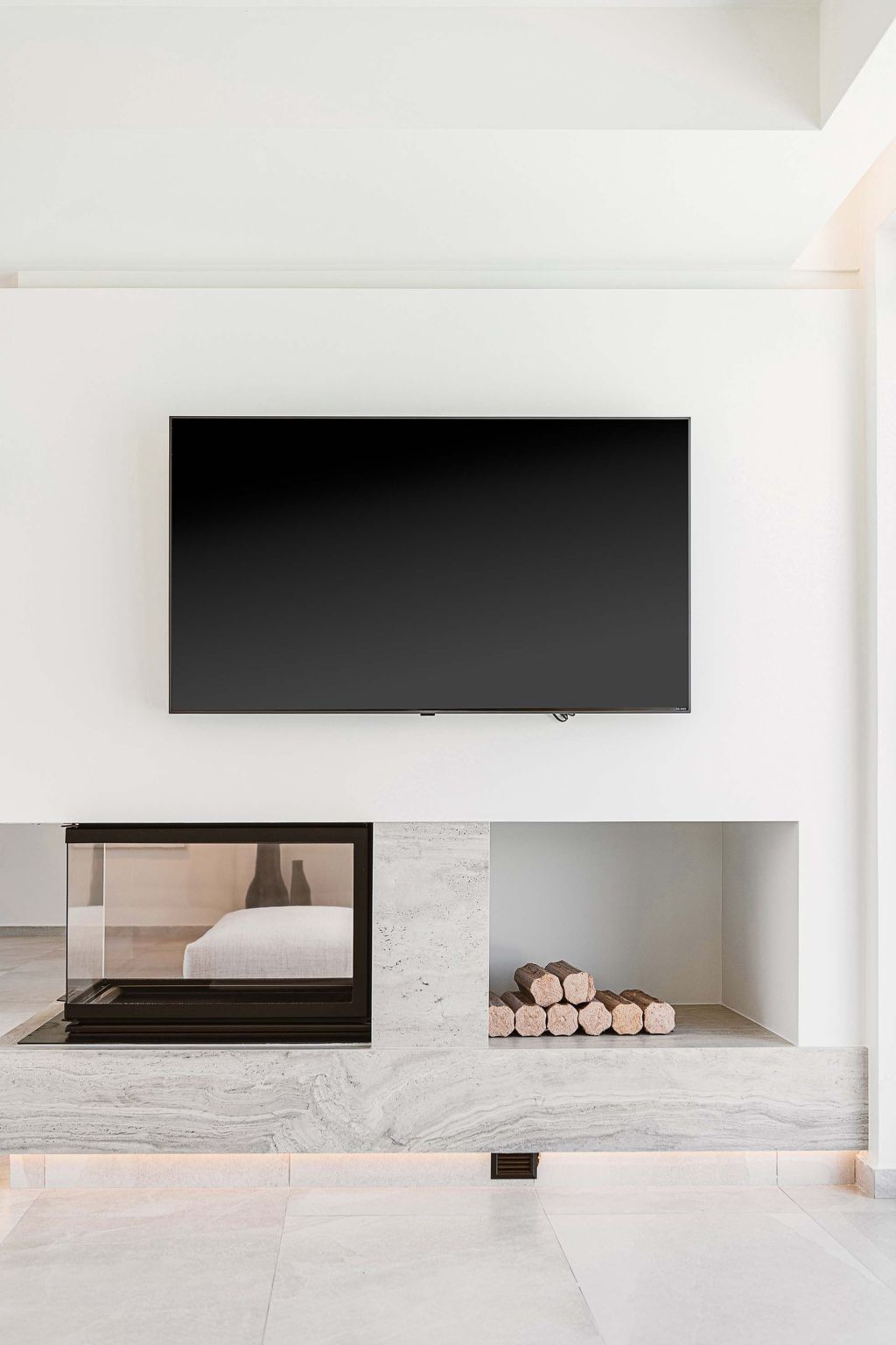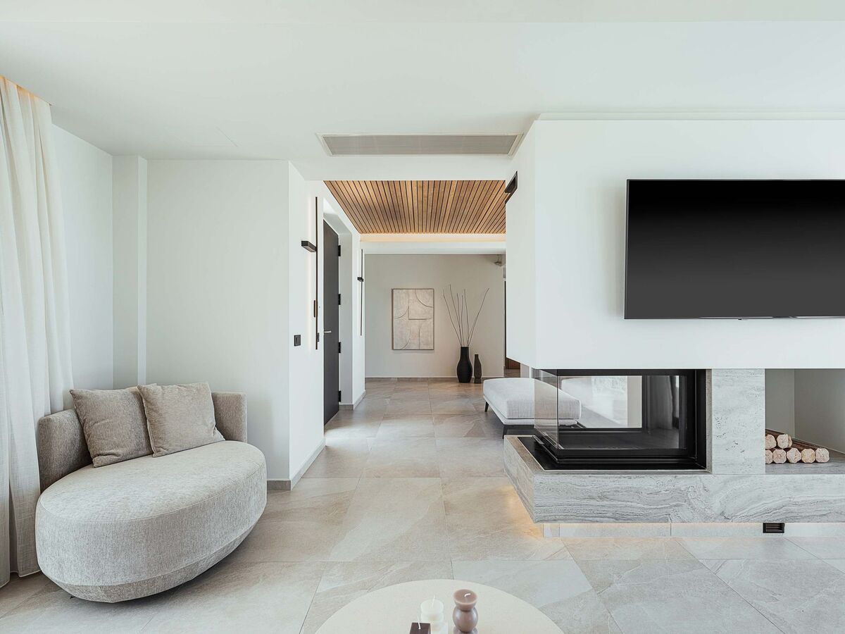 The area is completed with a dining room and a living room with a 55’’ smart Satellite TV and a fireplace.