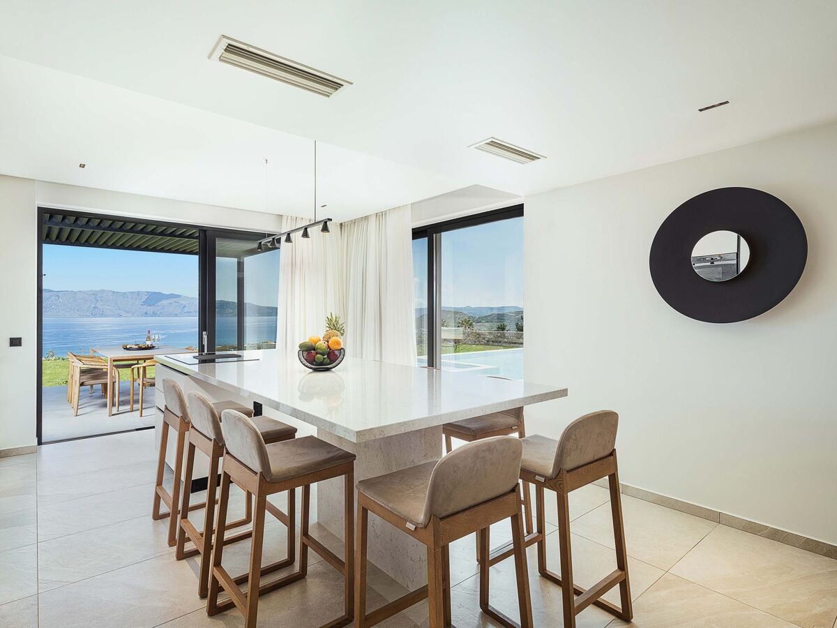 Entering the villa on the ground floor you will find a spacious open area with a fully equipped contemporary kitchen that has branded appliances and facilities, making holiday cooking a most pleasurable experience.