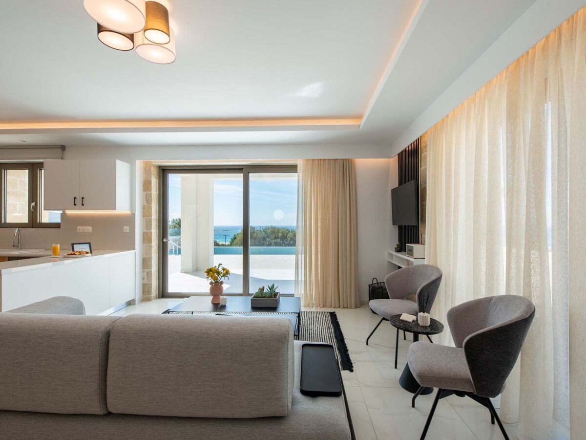 Salon avec canapé, télévision satellite Smart TV 43'', accès à la terrasse de la piscine, vue sur la mer
