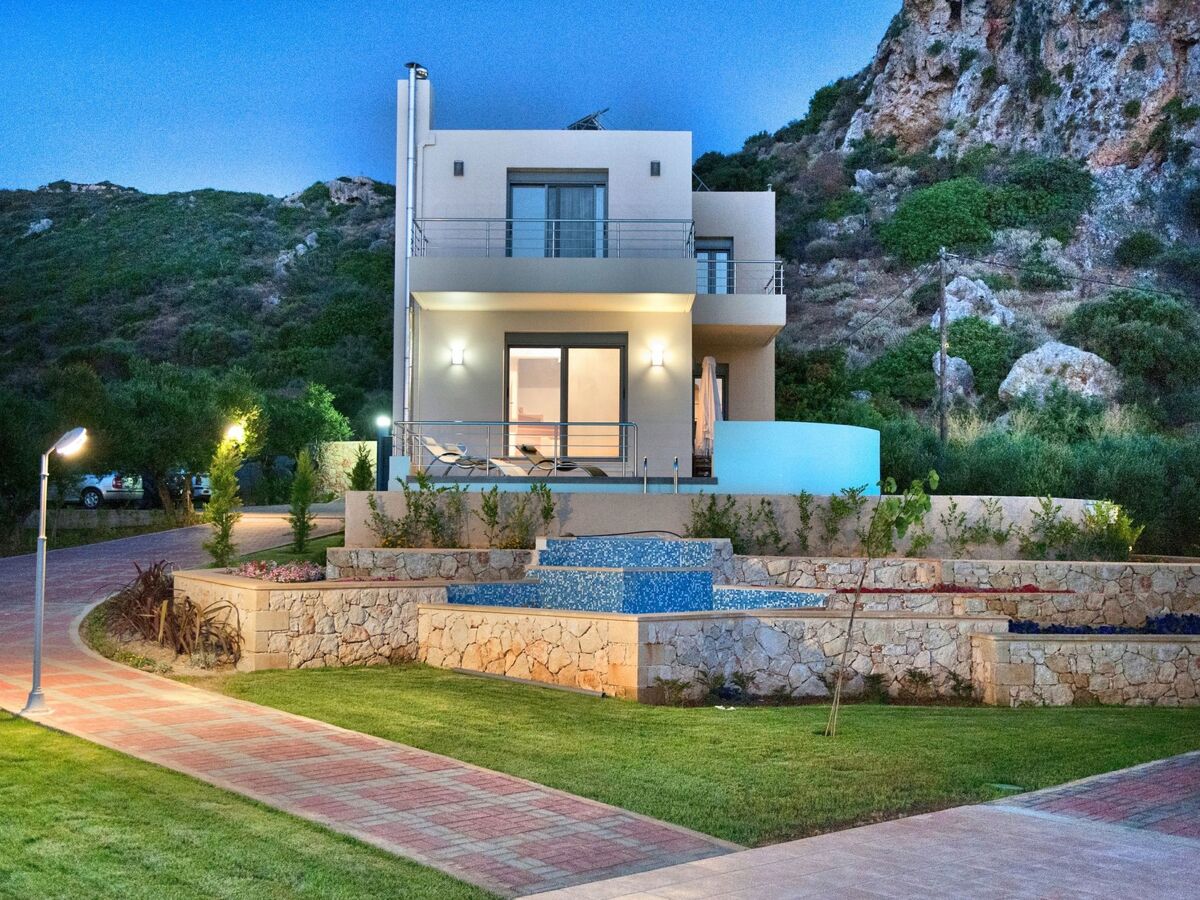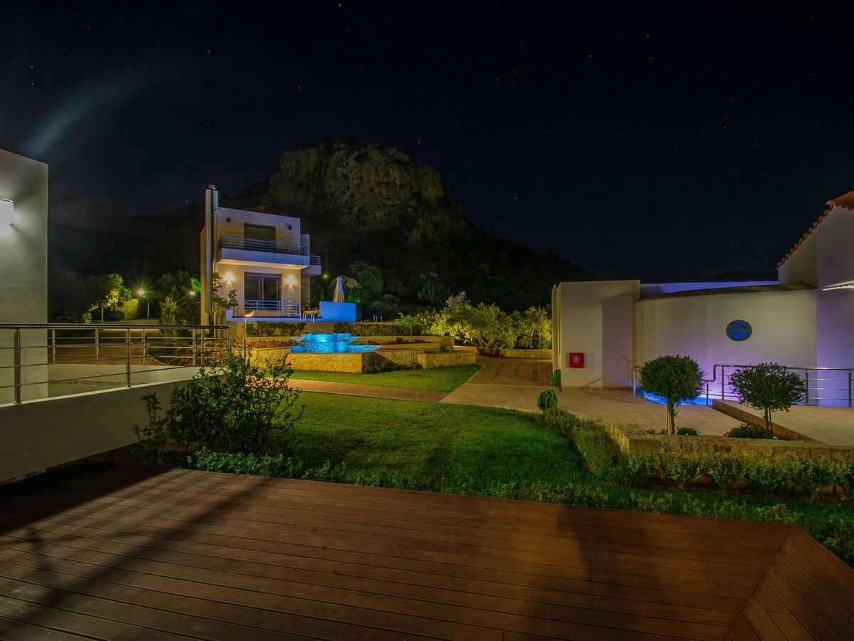 Colorful flowerbeds and gardens along with a small fountain, which follows the changing color pattern of the pool, surround the villa.