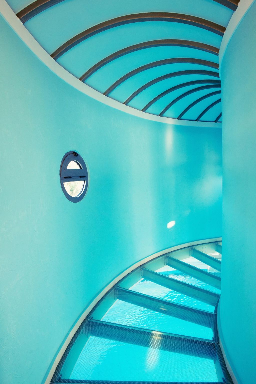 The corridor, as a bridge, is placed over the pool and allows the Illumination from the water to light up the house in a truly unique way.