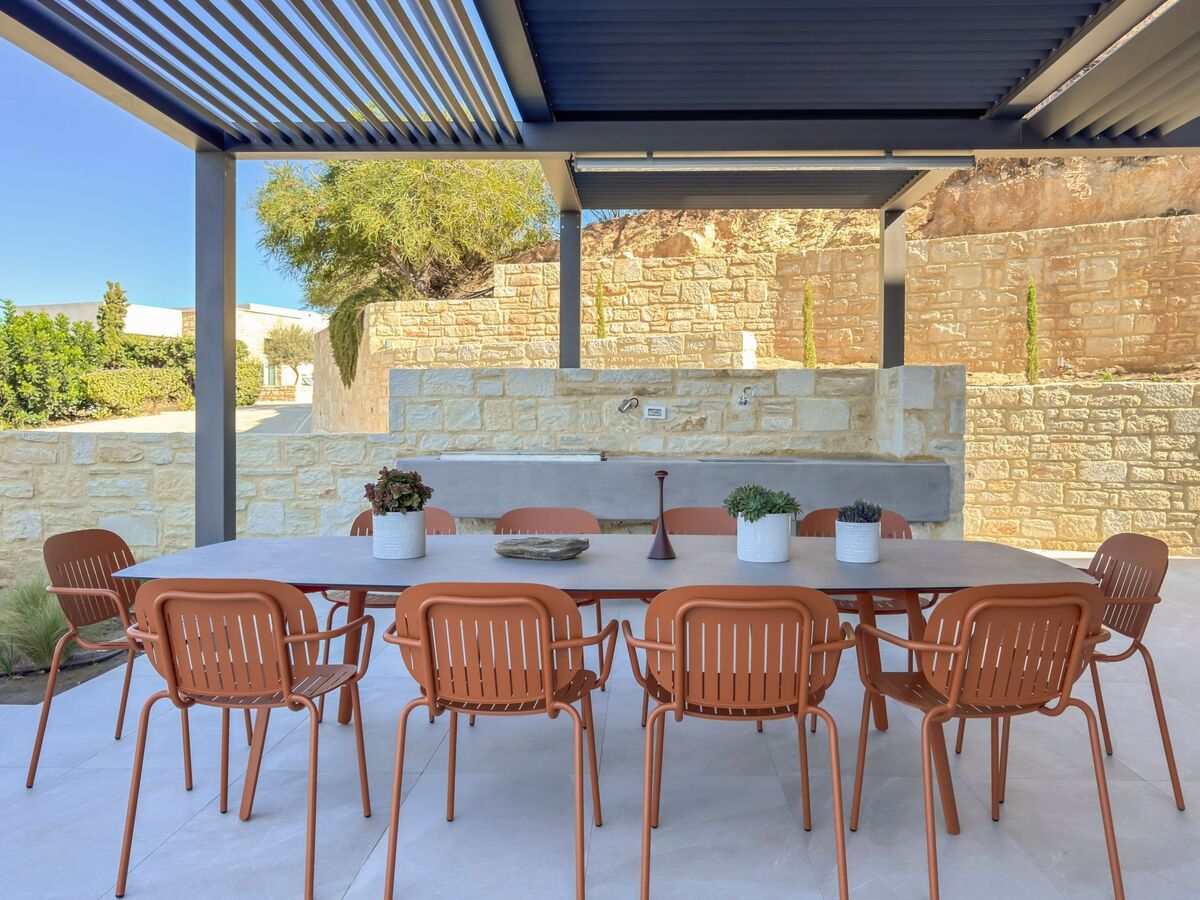 A pergola with an outdoor dining table invites guests to dine al fresco, next to a BBQ area ideal for culinary exploits with the region's freshest produce, offering a picturesque backdrop of the Aegean panorama.
