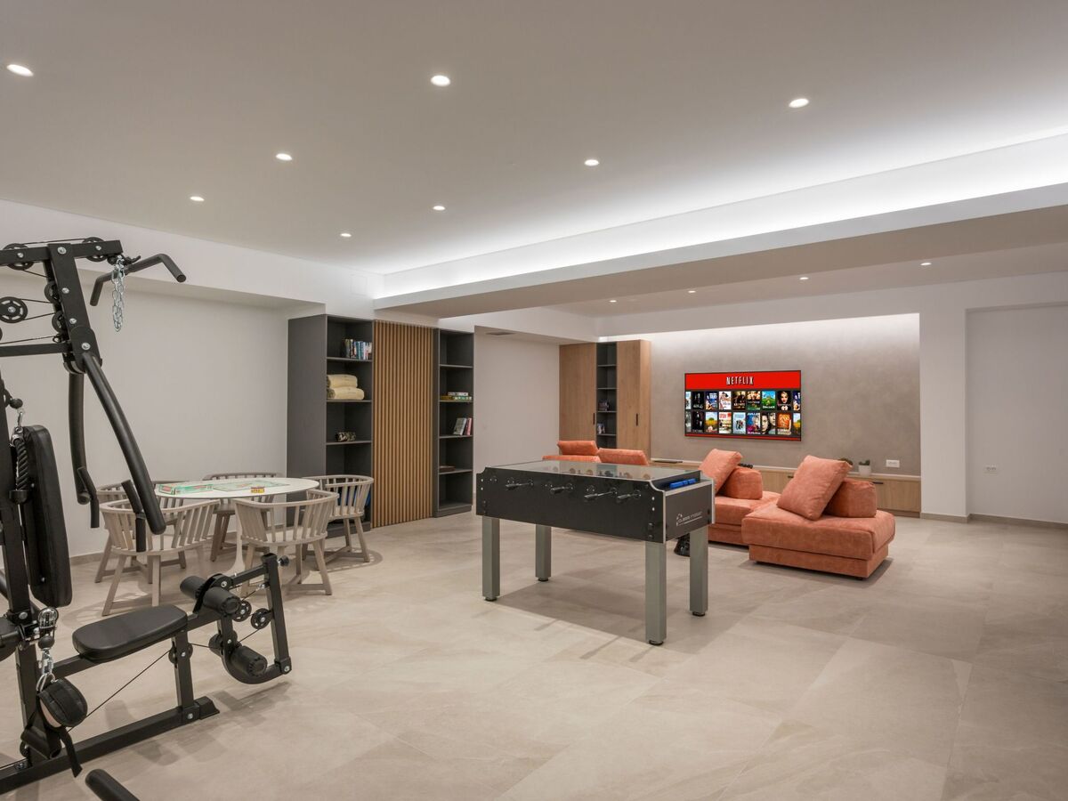 The outdoor area is designed for utmost relaxation and entertainment, featuring sunbeds, poolside mattresses, and sofas for lounging under the sun or stars.