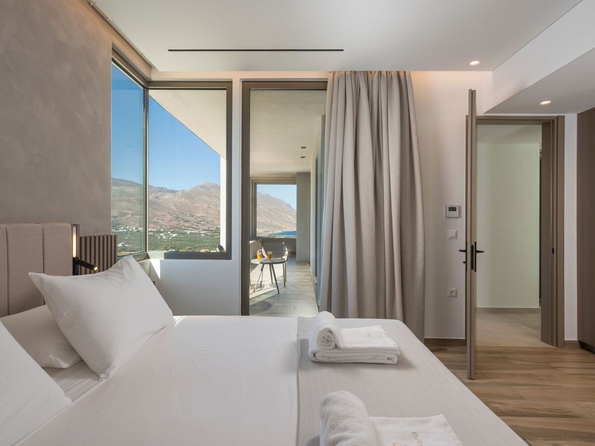 The upper-floor bedrooms bathe in natural sunlight, enhancing the serene view of olive groves stretching towards the alluring Bay of Kissamos, and each room comes with an en-suite bathroom and veranda access, perfect for private moments of relaxation.