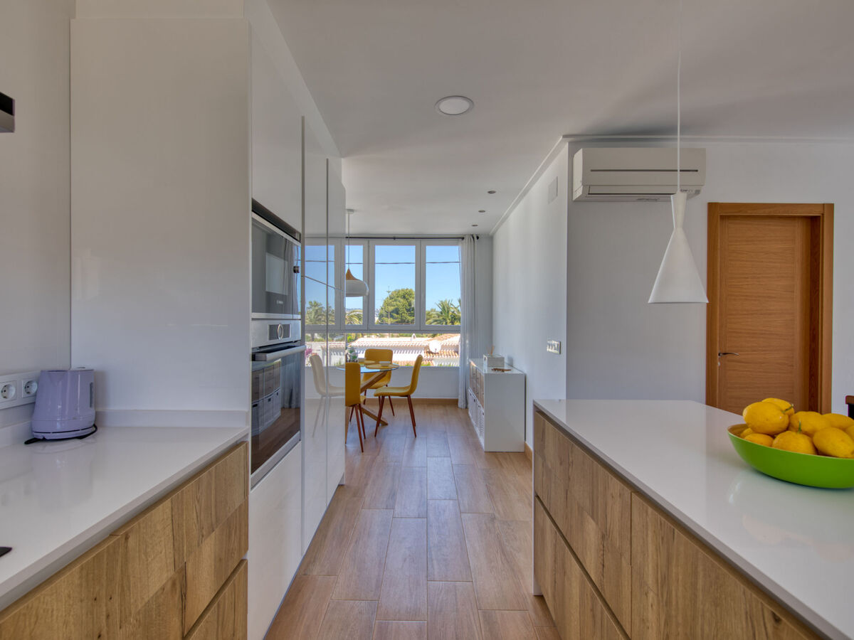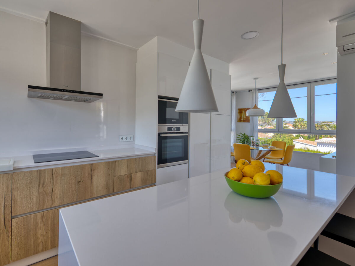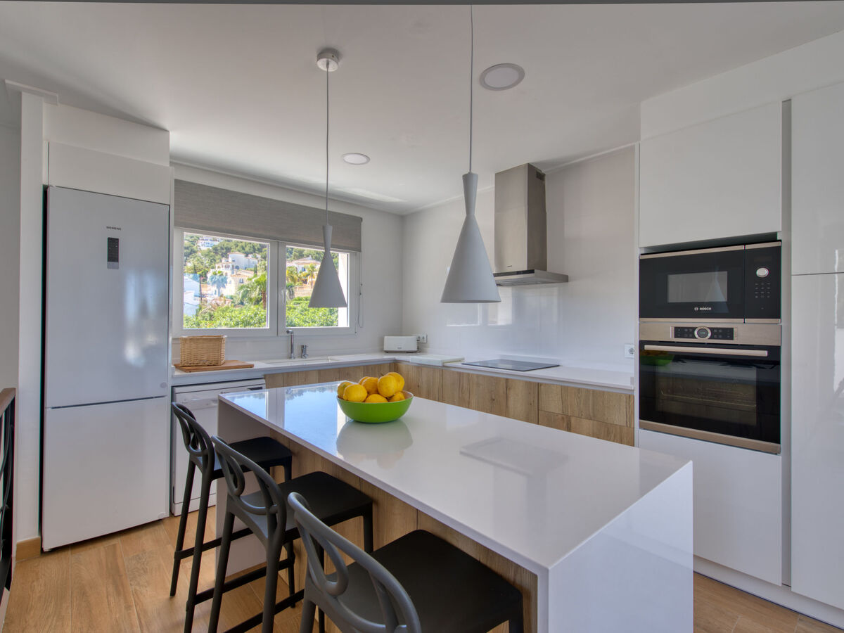 Cuisine ouverte (four, lave-vaisselle, 3 plaques à induction, micro-ondes, congélateur, cafetière électrique) avec air-conditionné et chauffage à air chaud.