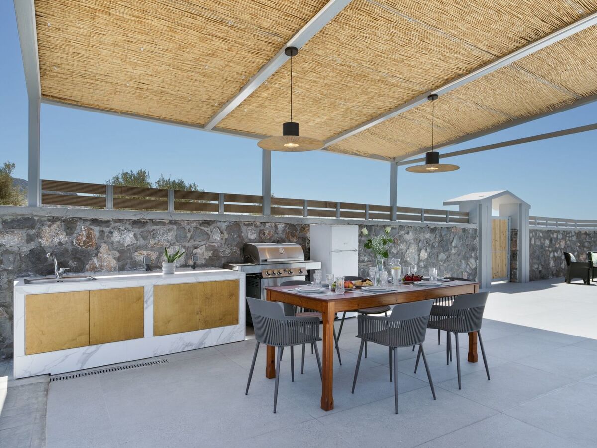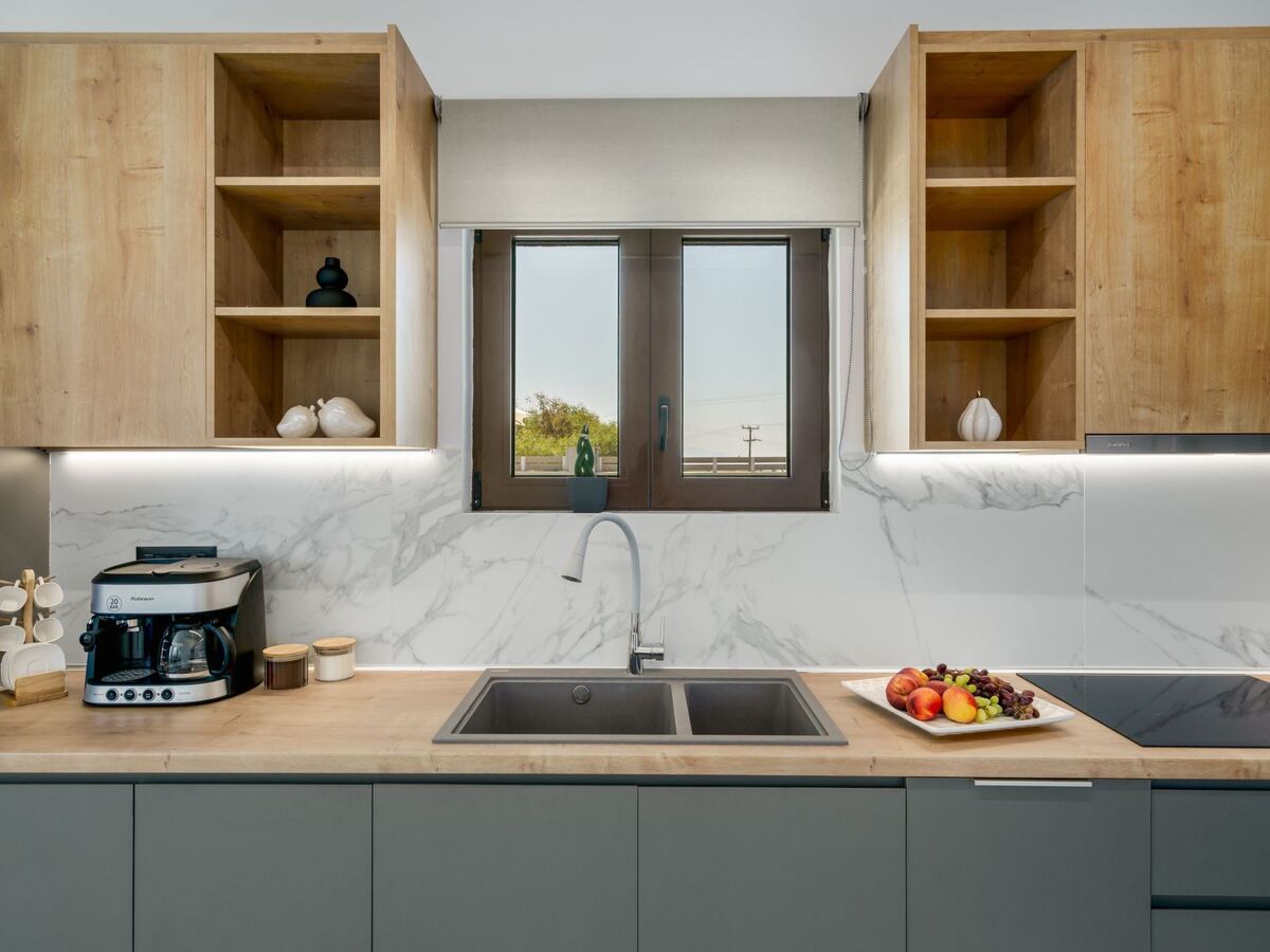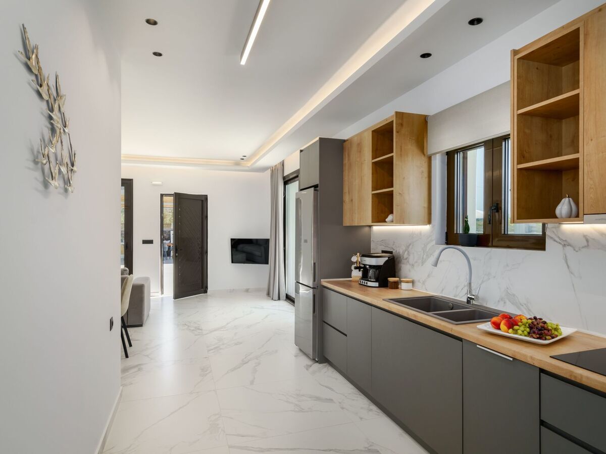 The villa features a well-equipped kitchen with high-end appliances, including a stove, oven, dishwasher, and both coffee and nespresso machine.