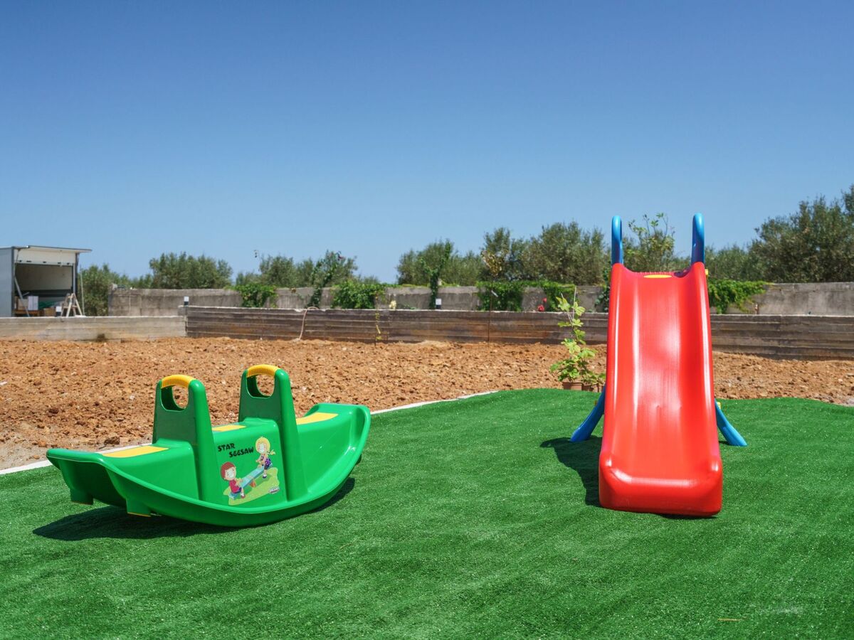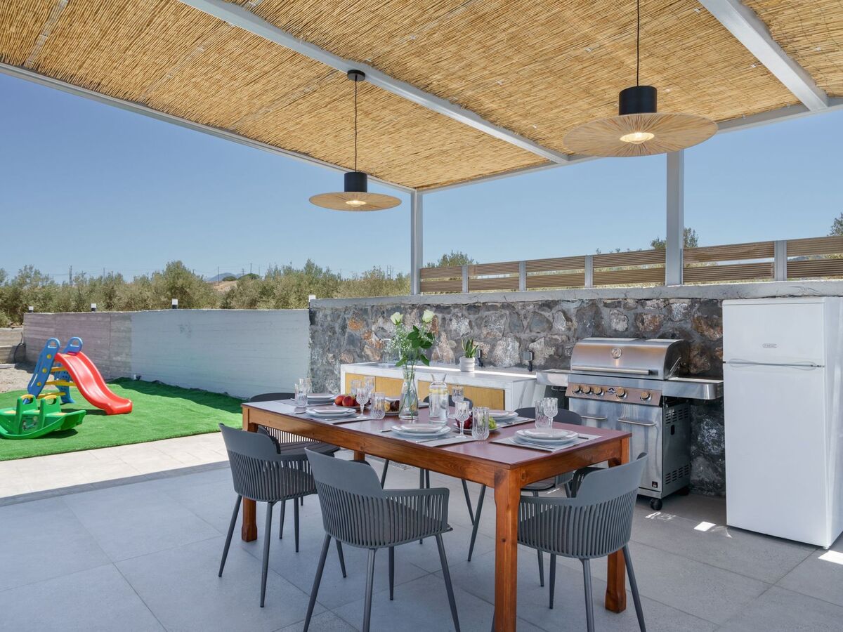 The outdoor area includes a fully equipped kitchen, a BBQ area, a dining table for alfresco meals, and a dedicated children's play area.