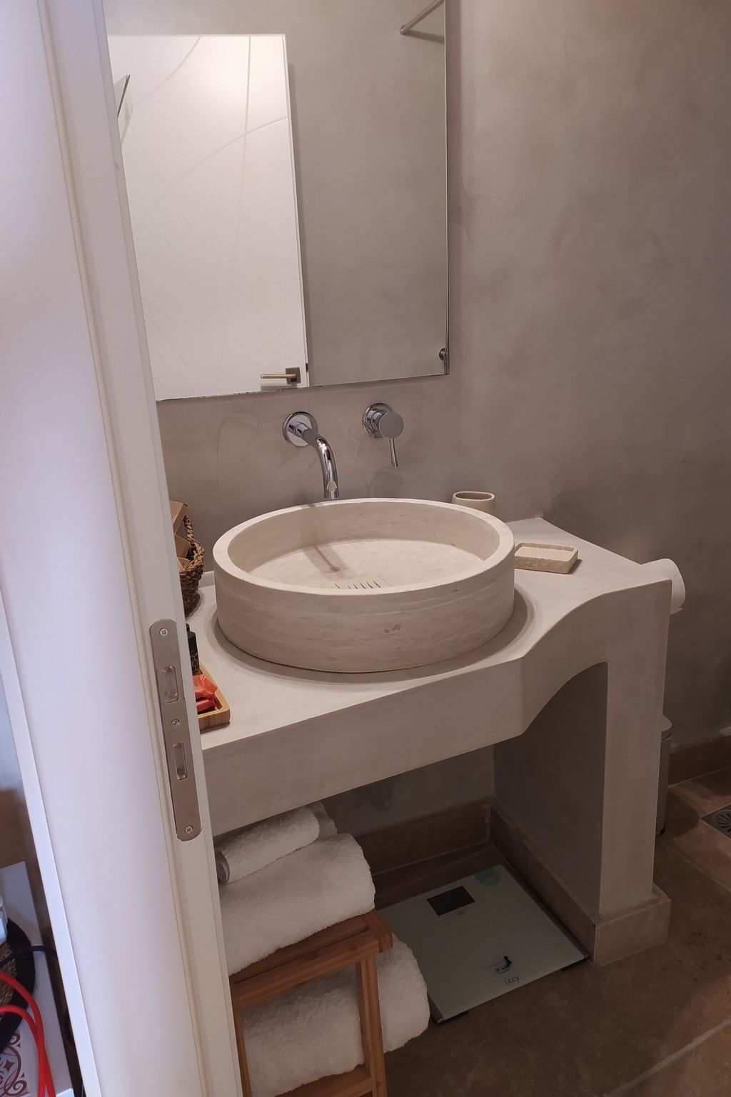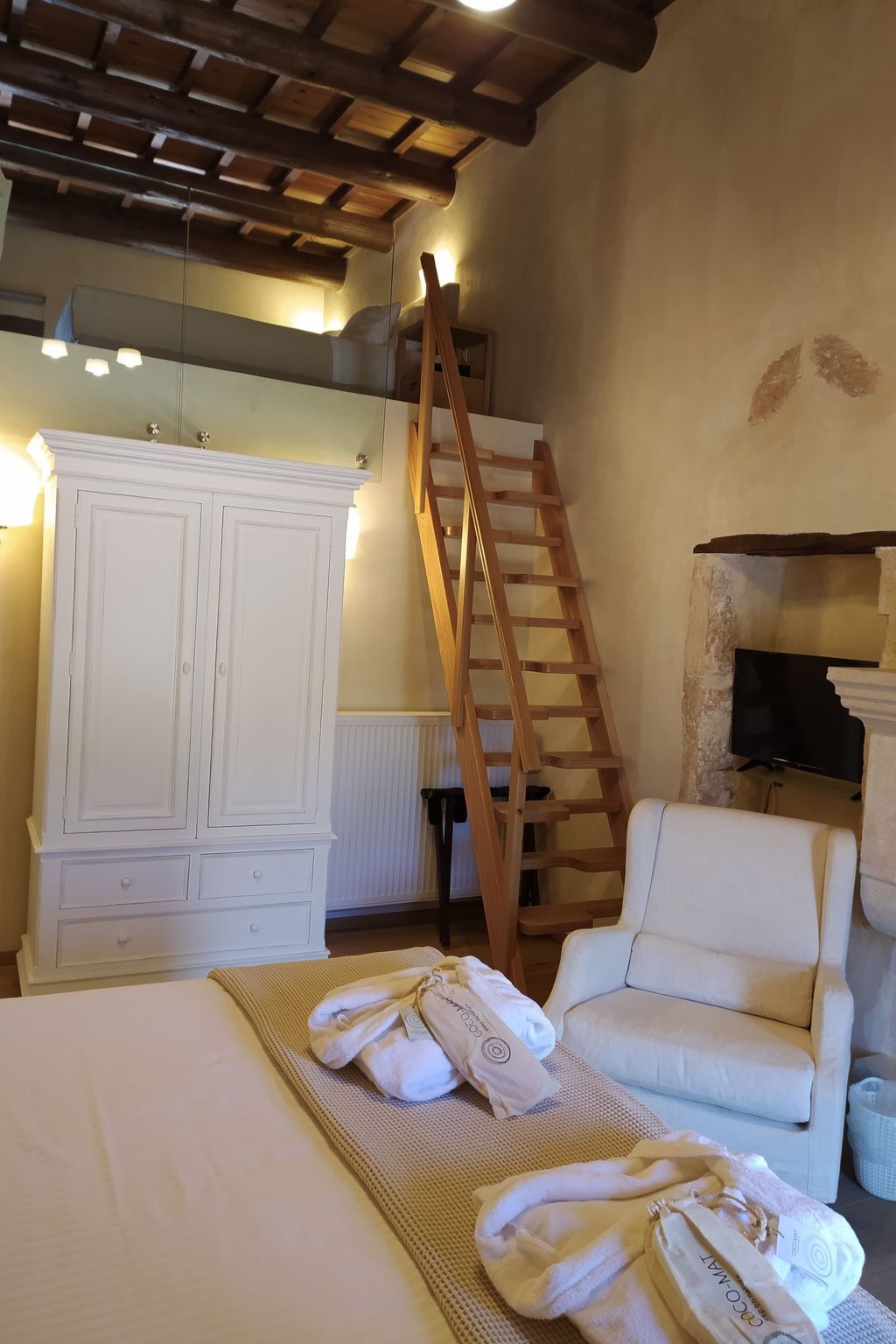 The main bedroom is for 4 people with a queen bed, fireplace and view to the inner yard - as the ceiling is very high, a mezzanine with two beds was created, with a view to the terrace.