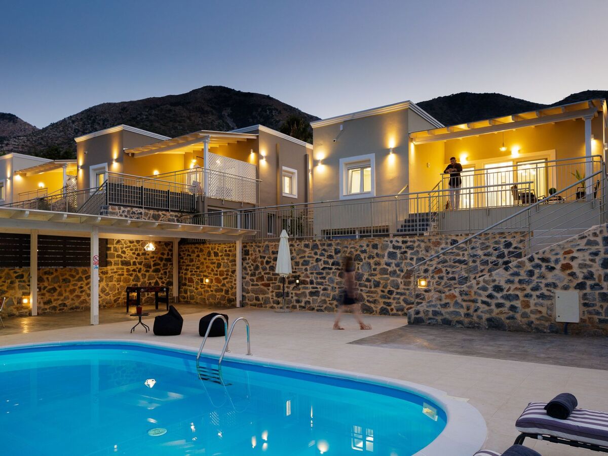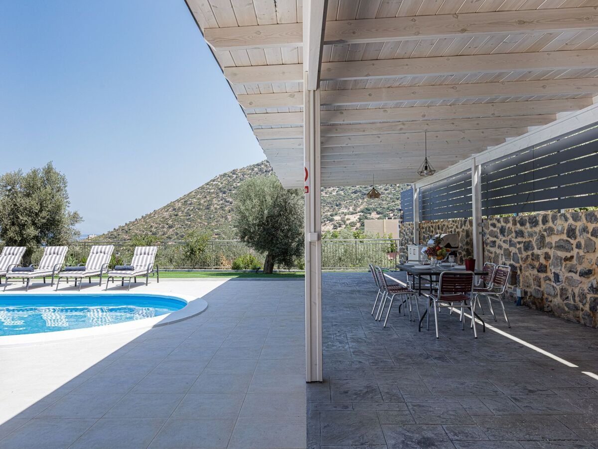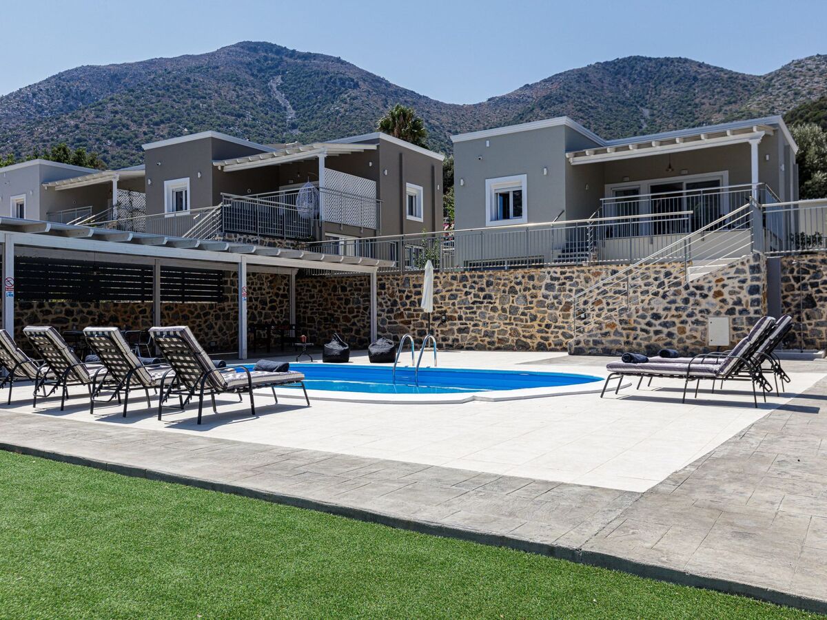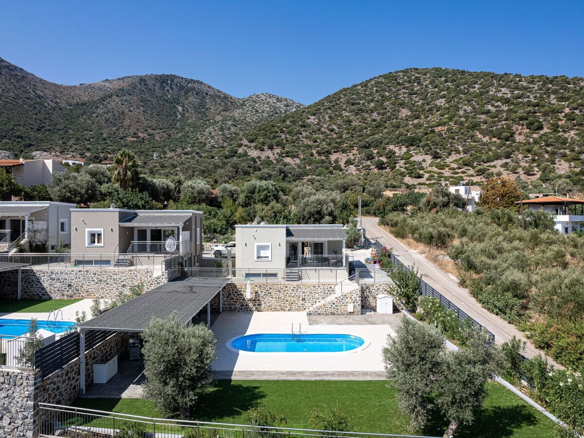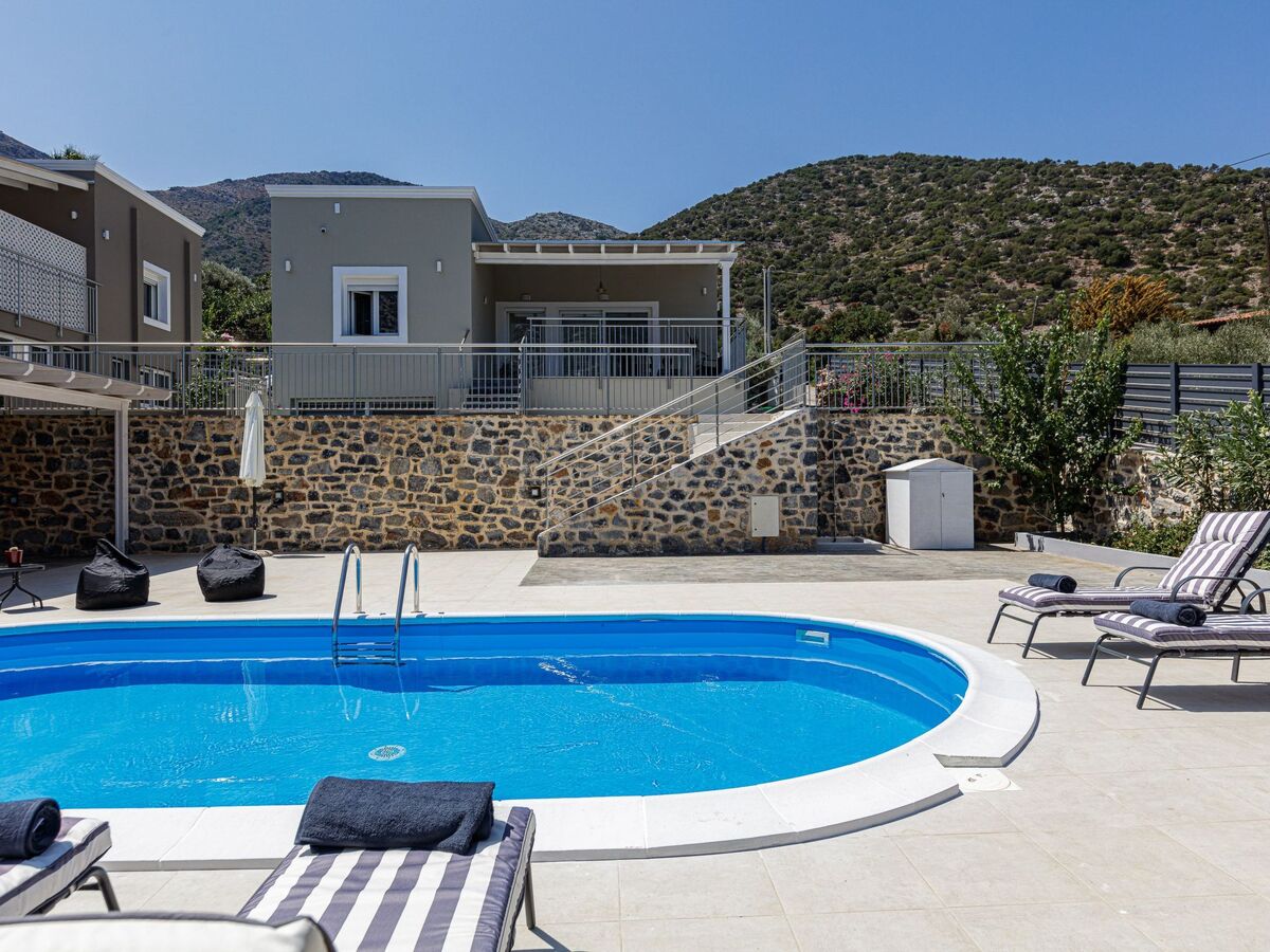 The impeccable outdoor area is host to a private swimming pool in a tranquil garden setting, perfect for families to sit back and enjoy their Crete vacation.