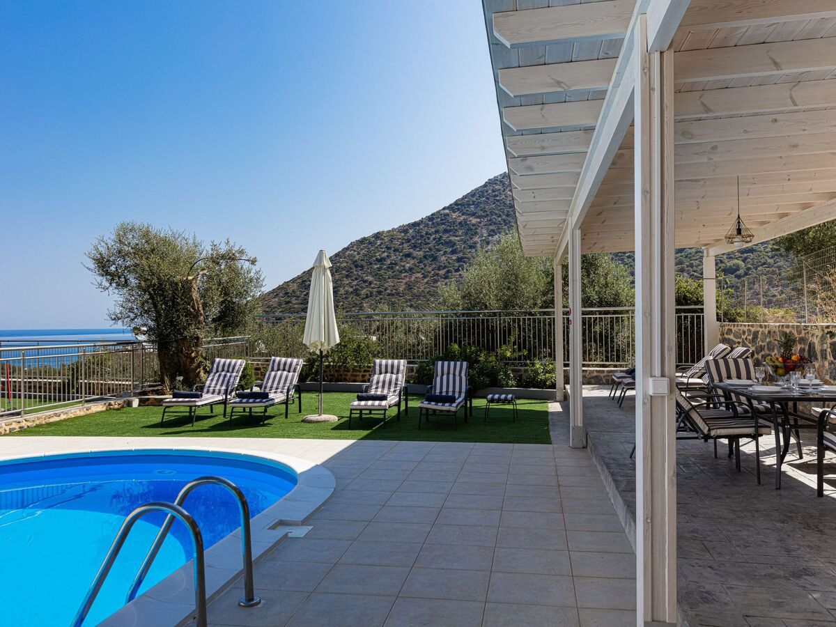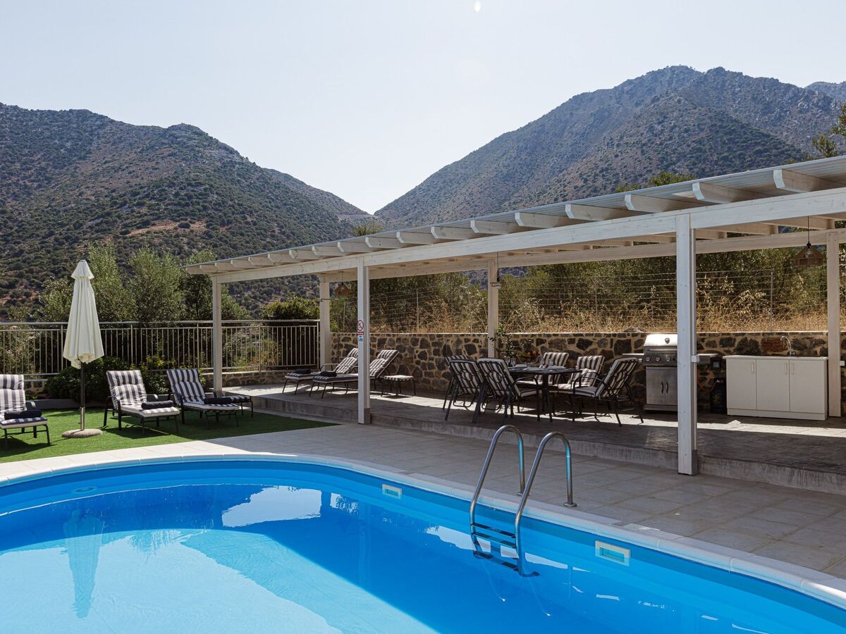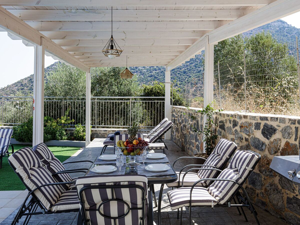 This Crete holiday villa has an extensive outdoor entertainment area, shielded by a large pergola.