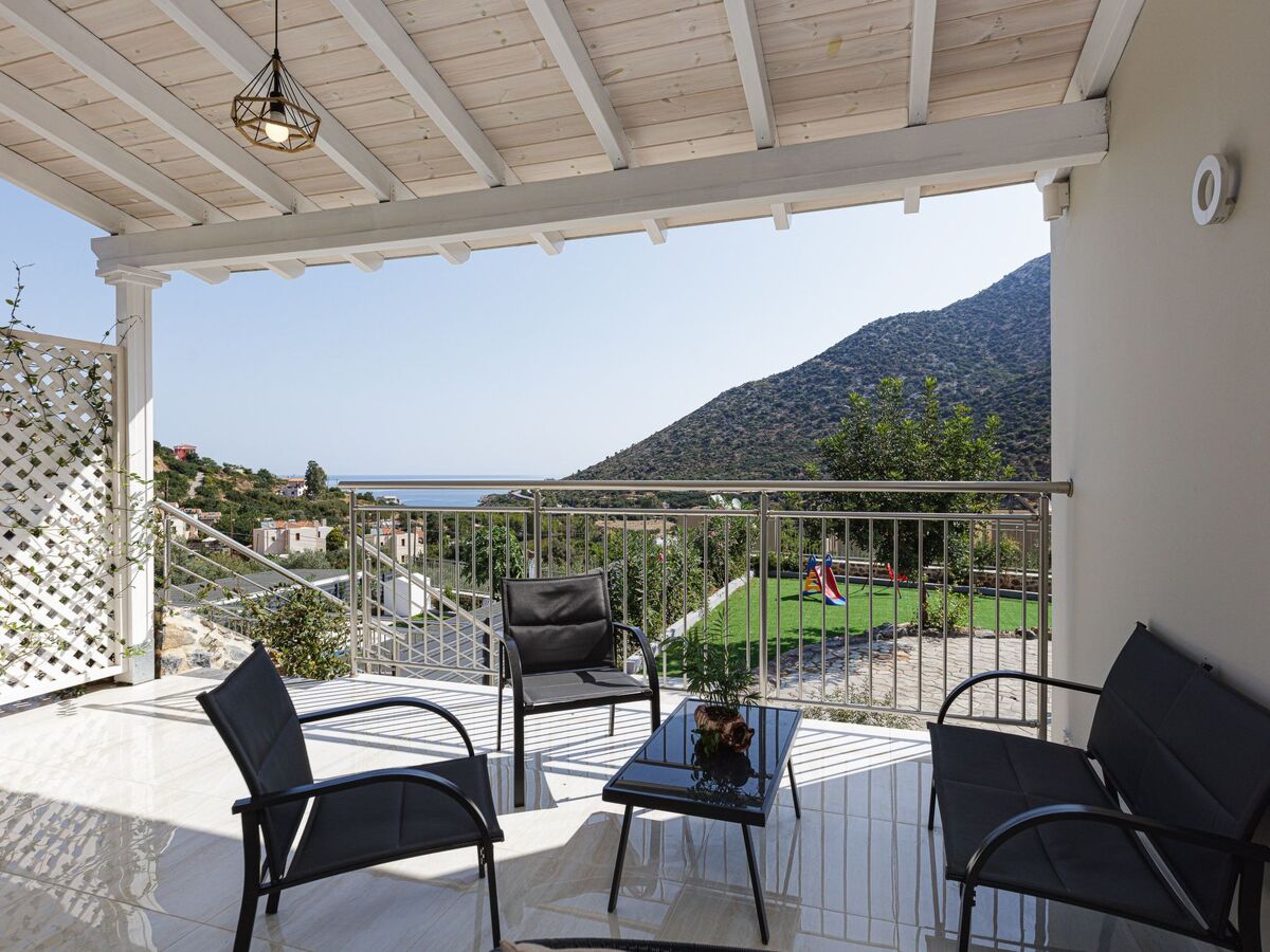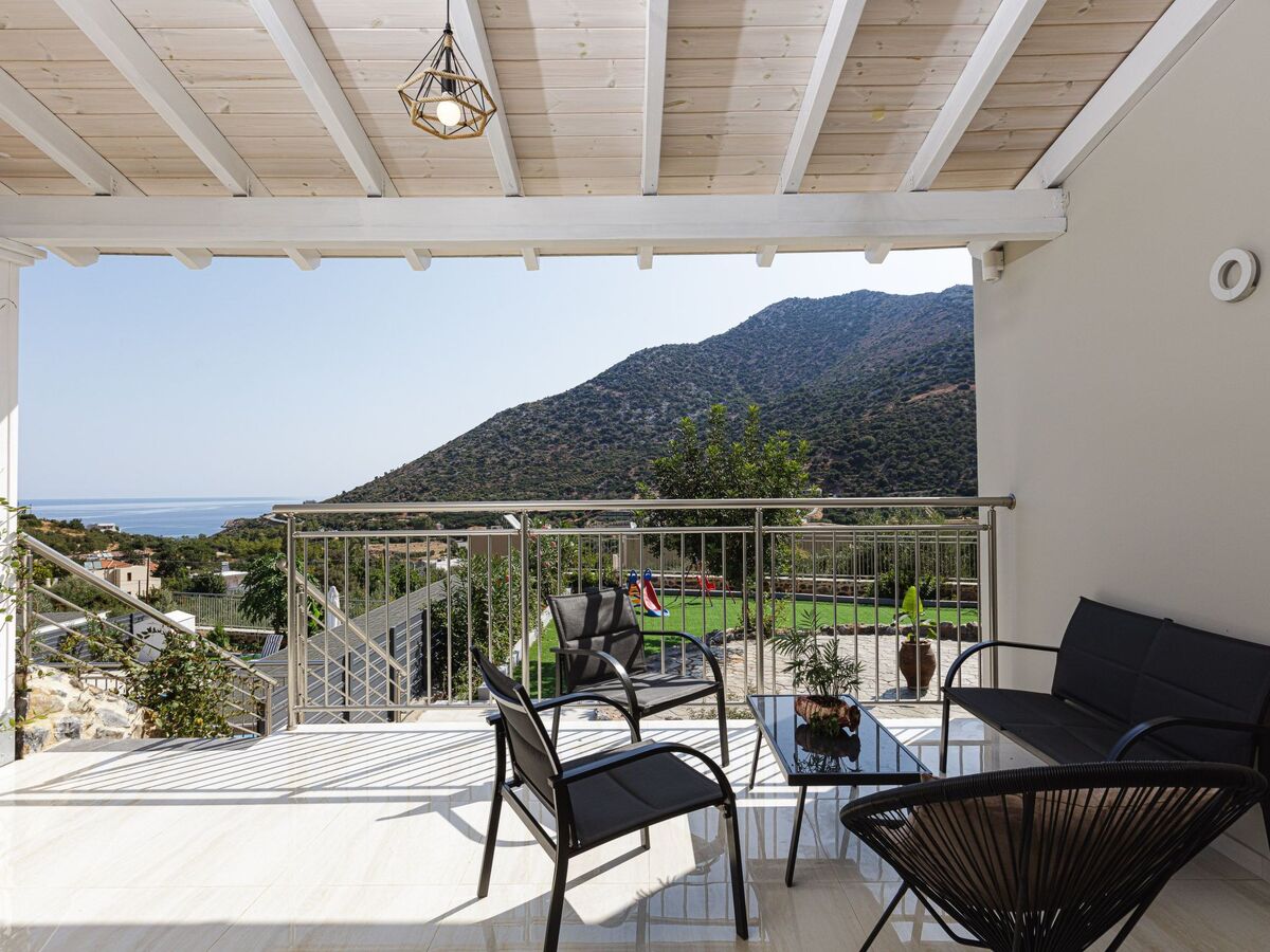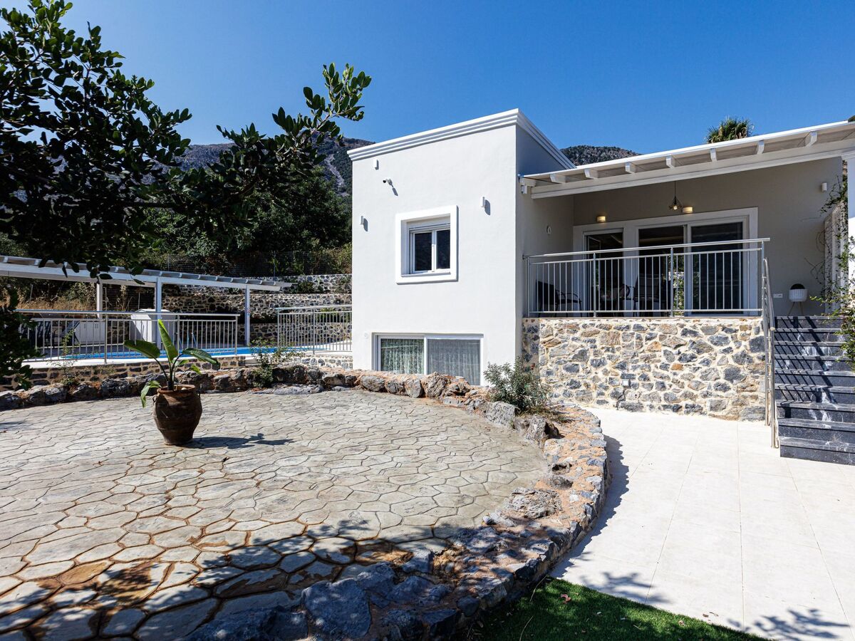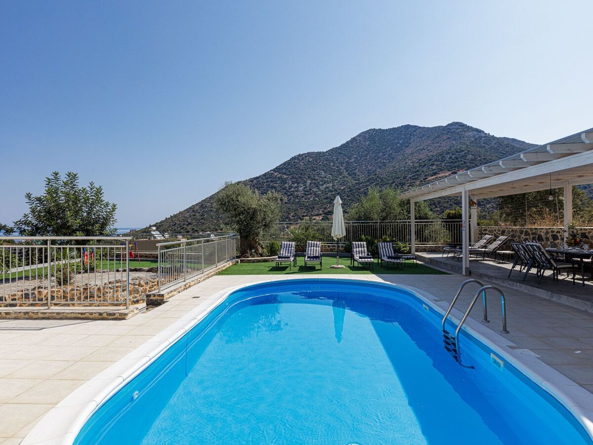 This Crete holiday villa has an extensive outdoor entertainment area, shielded by a large pergola.