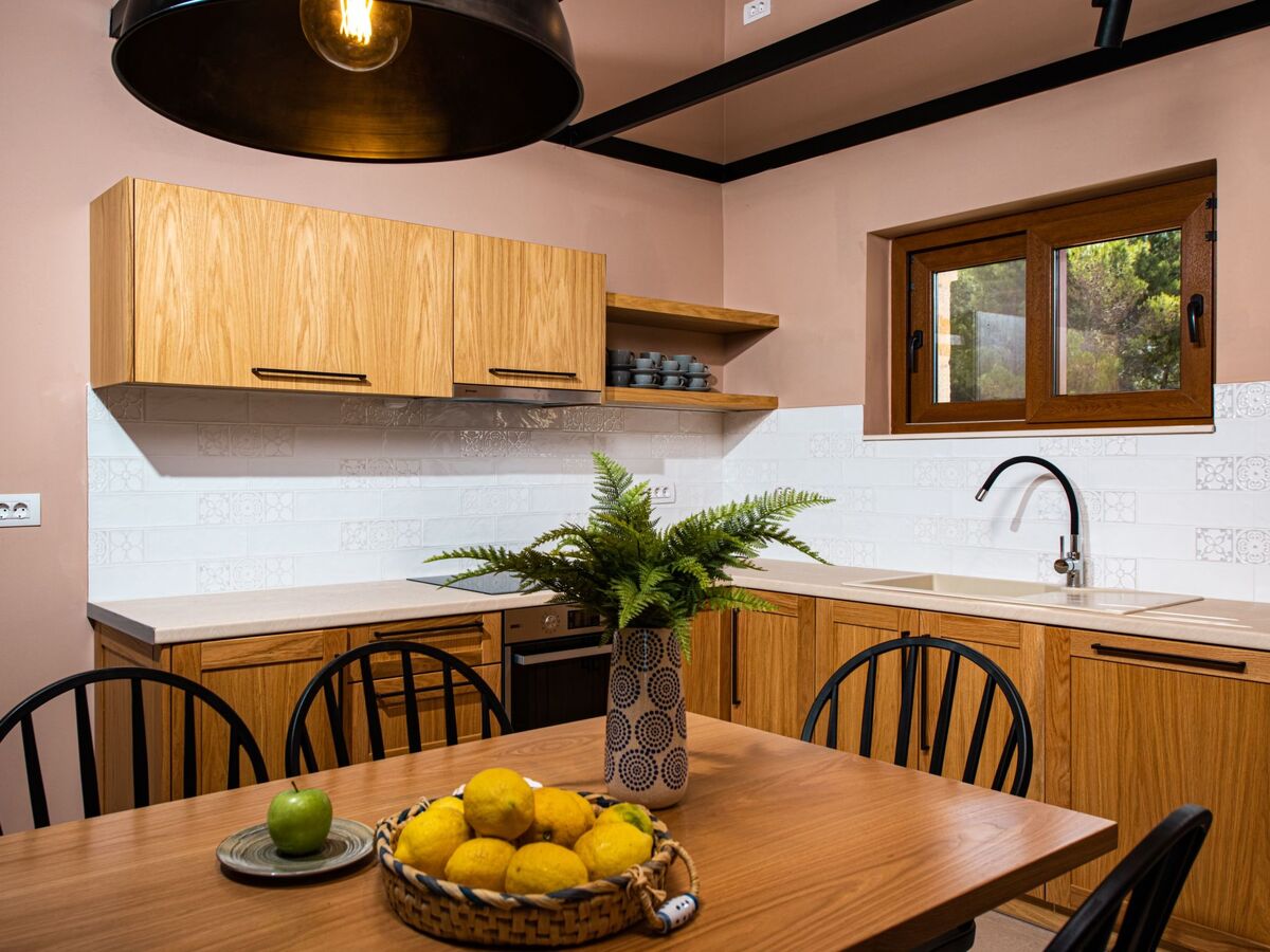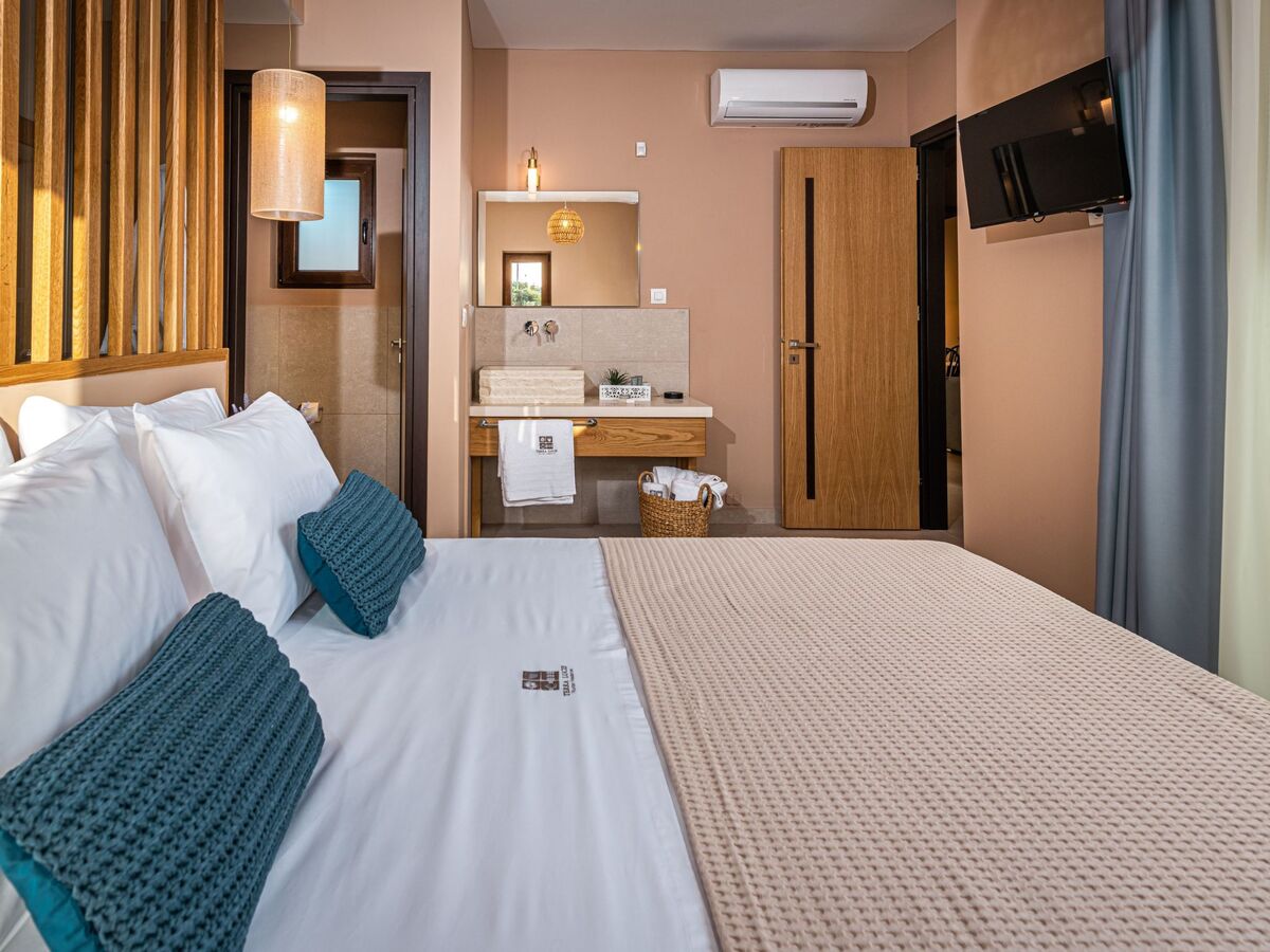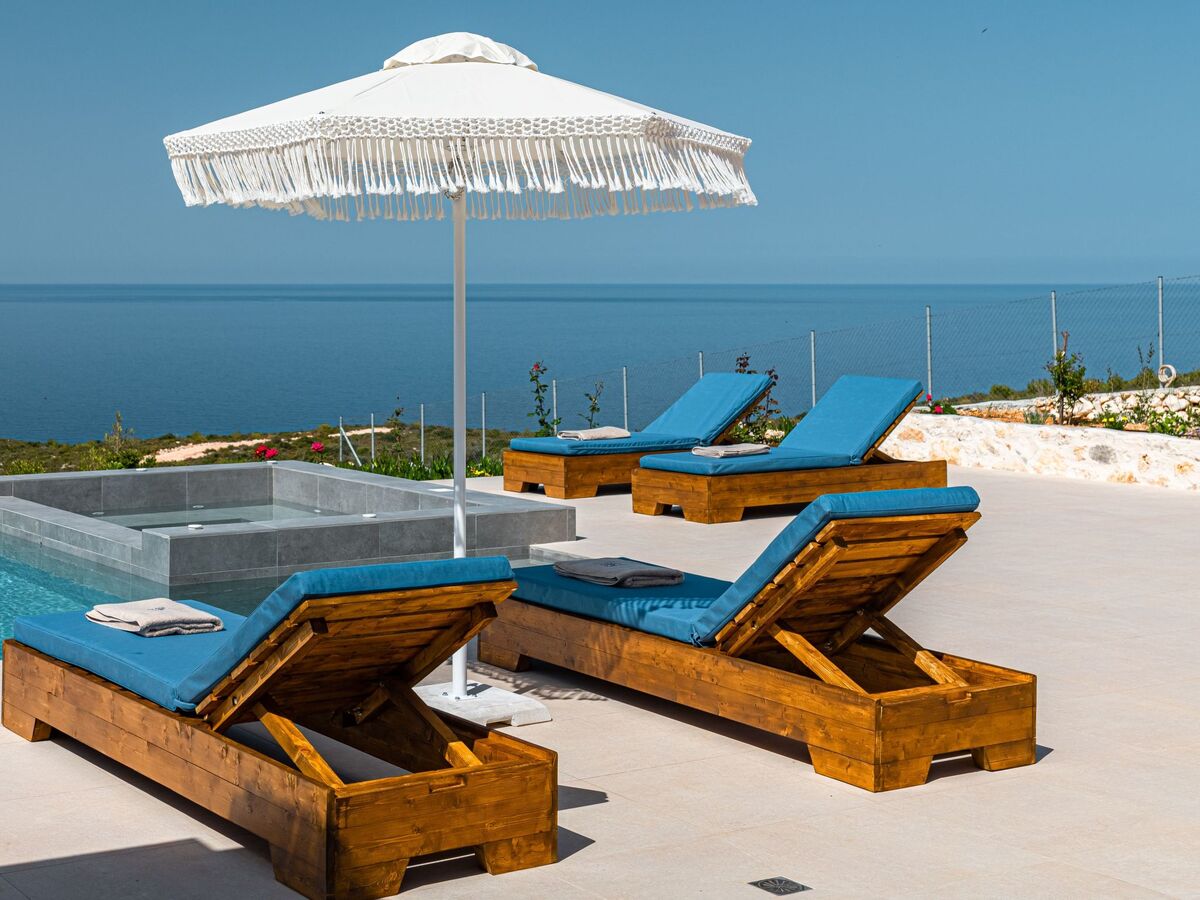 One of them, Porto Limnionas, is located in the area we chose to create the Terra Lucis Mountain Residences.In this area in general and in particular near to our accommodation, the tourist development is mild and does not follow the rhythm of the major tourist resorts of the island.Here the visitor can really feel what Ionian Sea and Zakynthos means, listen to the natural sounds, smell the herbs and flowers, feel connected to the vast sea, swim under the sun or the moonlight, touch the blessed fruit of the olive tree or just enjoy the setting sun in the endless blue of the Mediterranean.There is a BBQ area with an external kitchen and garden furniture as well as sunbeds and umbrellas in the outside area next to the pool.The private infinity pool also features an outside jacuzzi and an outdoor shower in the pool area.There is enough parking space in the property and two cars can be parked in a shaded place.Mare Villa is a two bedroomed 107 square meters villa situated in a 2,75 acres plot of land.It consists of two master bedrooms one with a king size bed and the second with two single beds that can be made up as a double with a topper,both with ensuite bathrooms and a living room with a fireplace and two sofa beds.