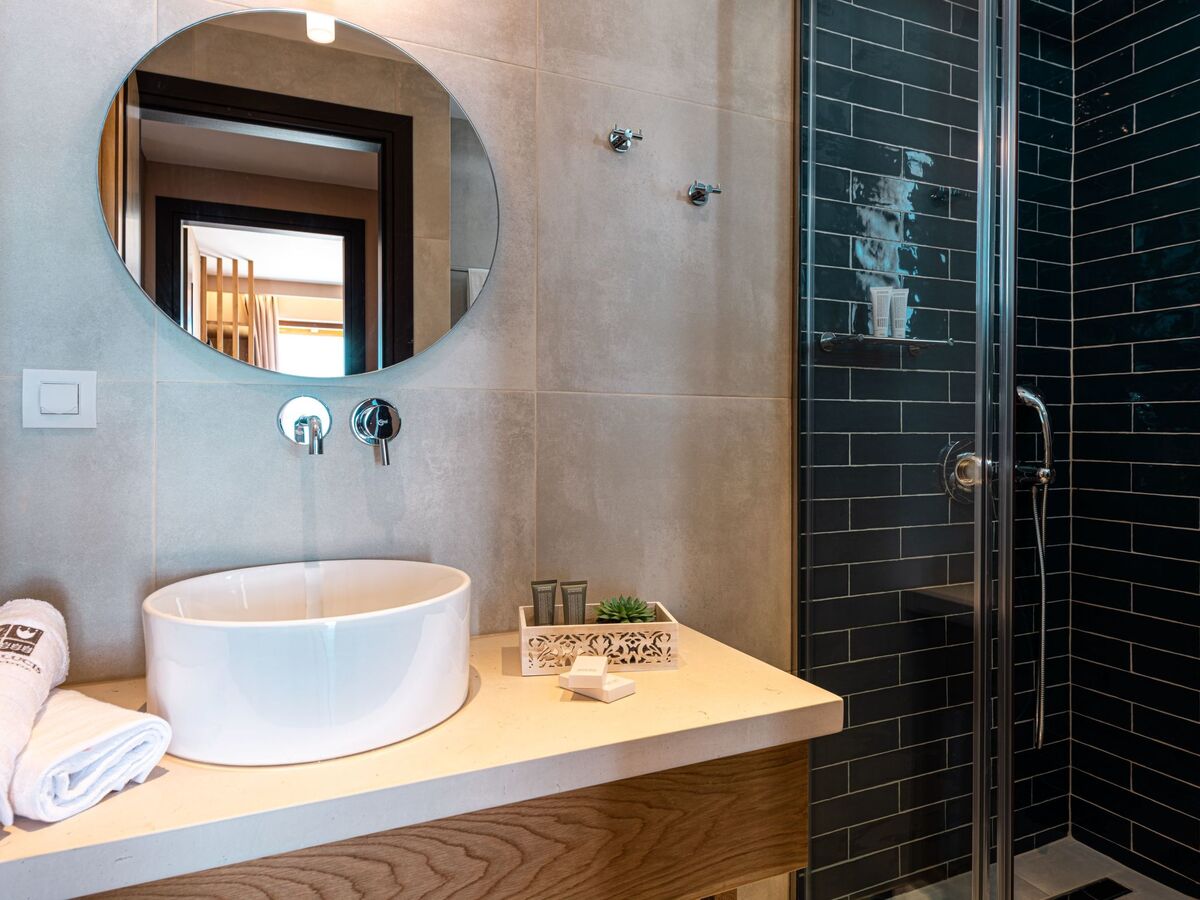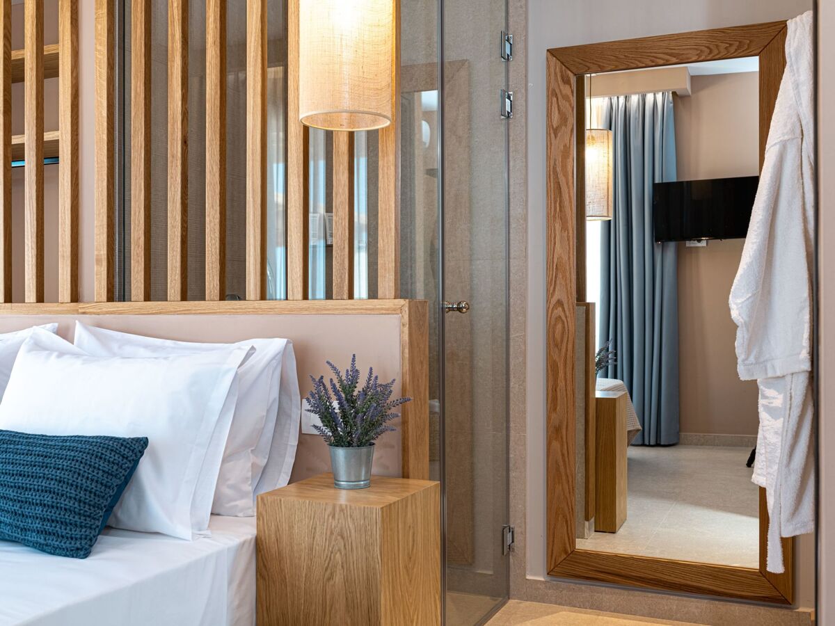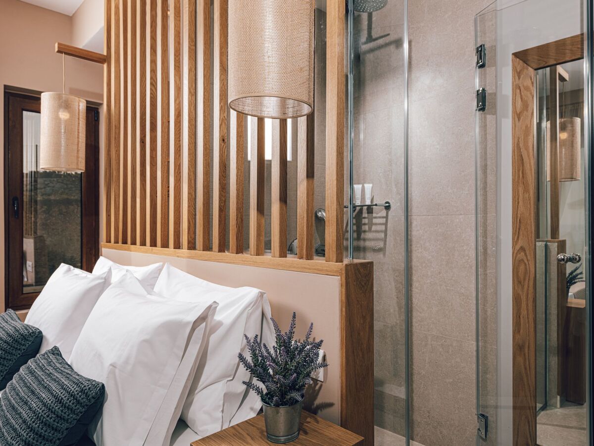 One of them, Porto Limnionas, is located in the area we chose to create the Terra Lucis Mountain Residences.In this area in general and in particular near to our accommodation, the tourist development is mild and does not follow the rhythm of the major tourist resorts of the island.Here the visitor can really feel what Ionian Sea and Zakynthos means, listen to the natural sounds, smell the herbs and flowers, feel connected to the vast sea, swim under the sun or the moonlight, touch the blessed fruit of the olive tree or just enjoy the setting sun in the endless blue of the Mediterranean.There is a BBQ area with an external kitchen and garden furniture as well as sunbeds and umbrellas in the outside area next to the pool.The private infinity pool also features an outside jacuzzi and an outdoor shower in the pool area.There is enough parking space in the property and two cars can be parked in a shaded place.Mare Villa is a two bedroomed 107 square meters villa situated in a 2,75 acres plot of land.It consists of two master bedrooms one with a king size bed and the second with two single beds that can be made up as a double with a topper,both with ensuite bathrooms and a living room with a fireplace and two sofa beds.
