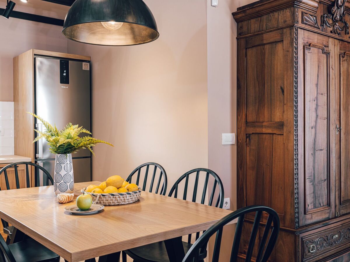 Both living room and dining area are in the same room, they have access to the outdoor area and a view to the pool and the sea.The dining area indoors and outdoors can sit 6 people.