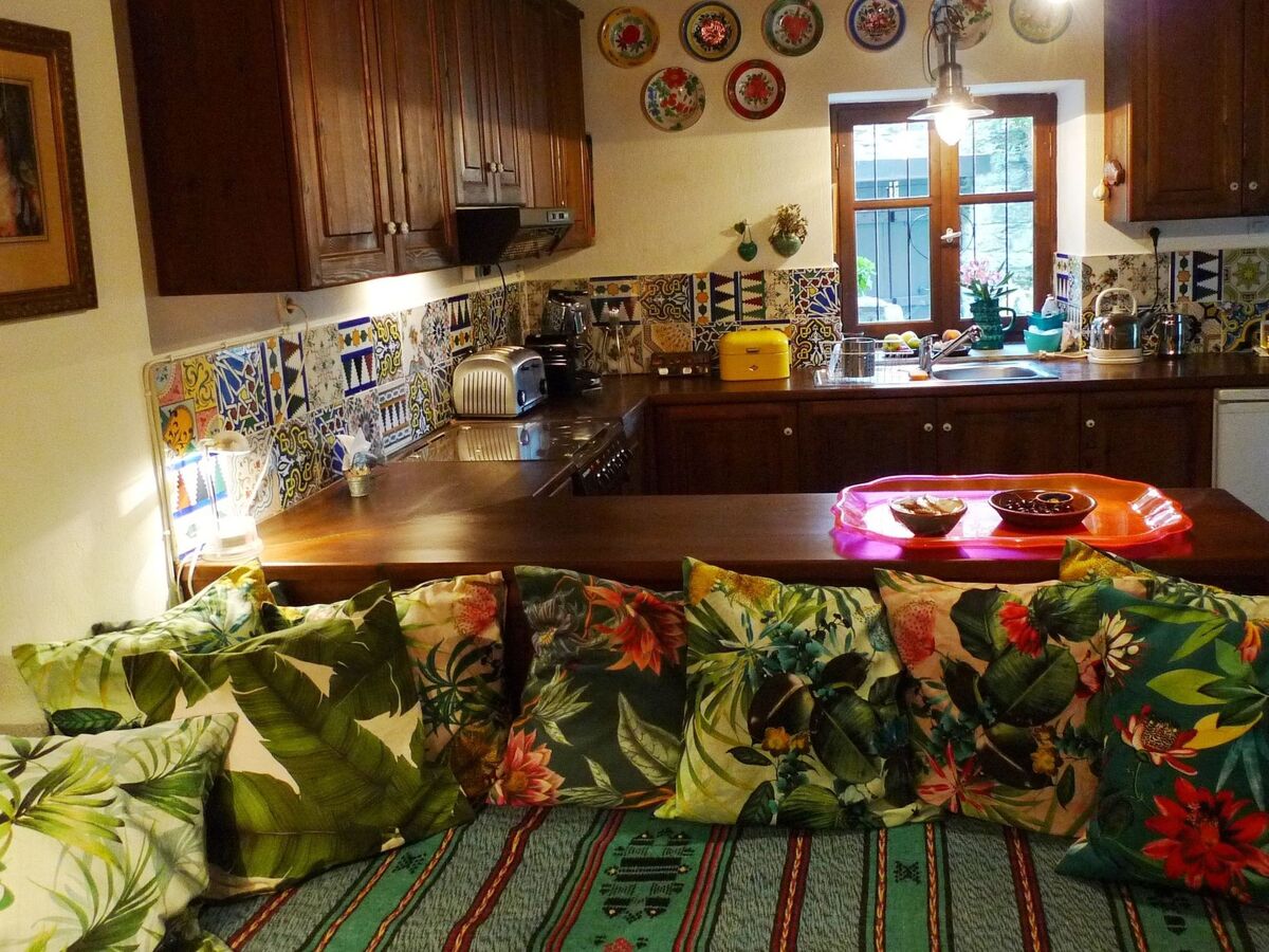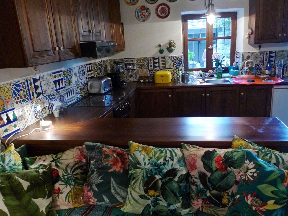 A breakfast bar separates the living room with fireplace, large sofa and beautiful old dining table from the beautiful kitchen.
