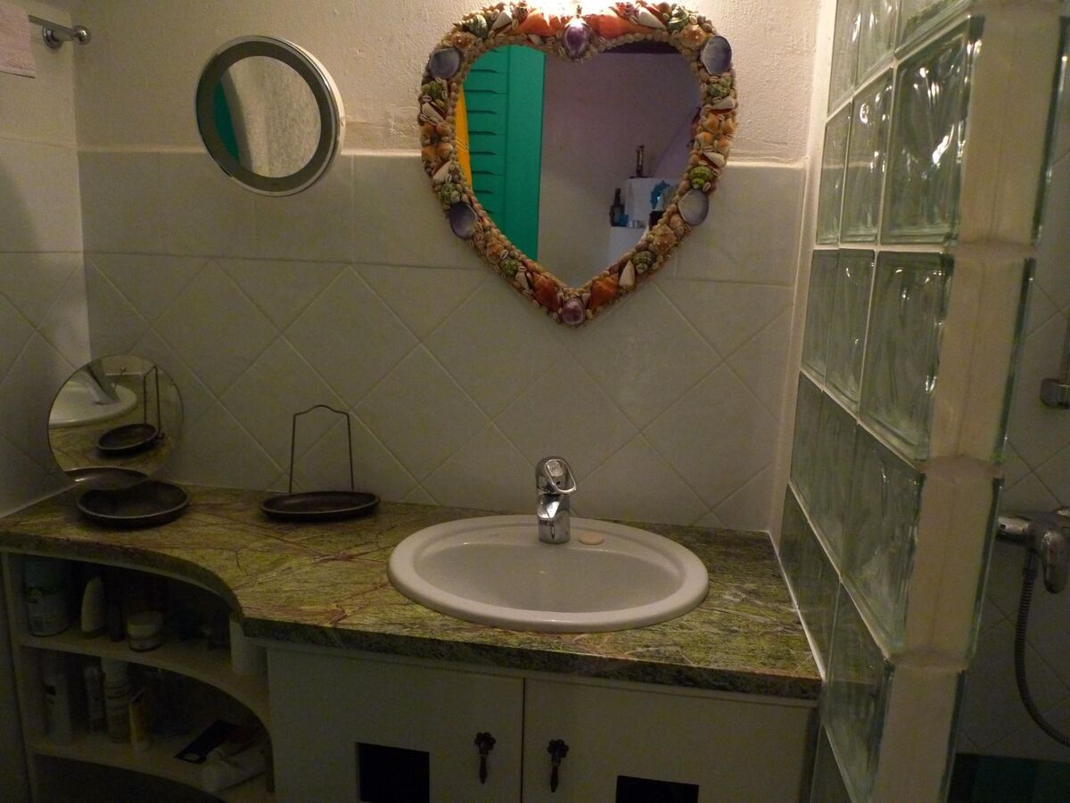 Also on the ground floor is the bathroom with shower, toilet, a beautiful sink and decorative mirrors.