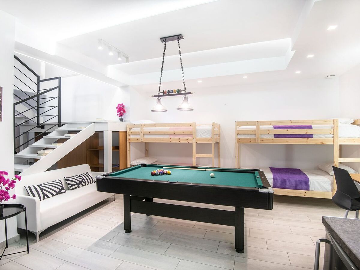 The basement is an entertainment hub with a disabled bathroom with an elevator that through all four floors, gym, billiard room, 4 bunk beds, a mini-kitchen, and laundry facilities, comfortably accommodating up to 17 guests.