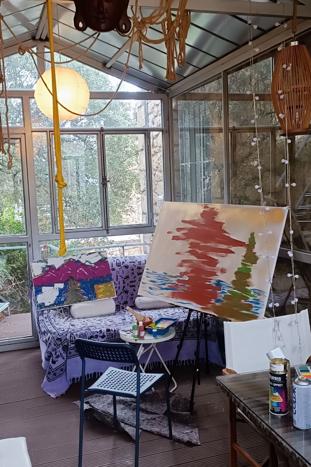 Easel, hand basin, dry WC, table and bed.