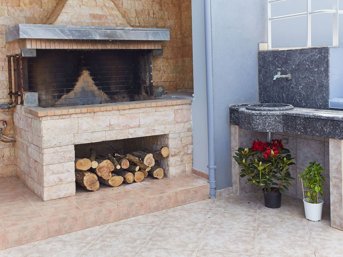 The first level has a kitchen, living room, a dining room, a fireplace and an interior barbecue.
