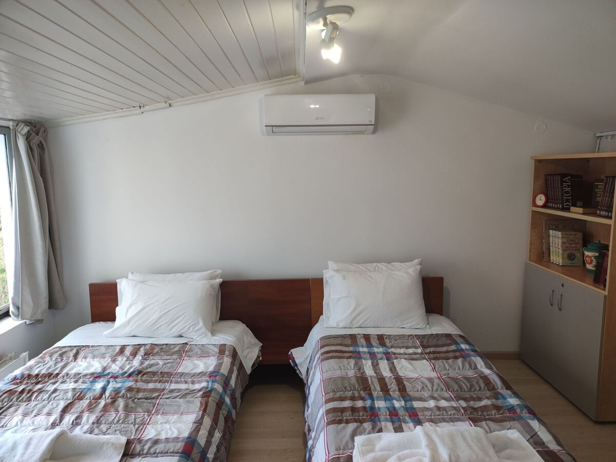 Au troisième niveau, il y a 2 chambres à coucher, une salle de bains et un bureau avec deux lits et un bureau avec un ordinateur.