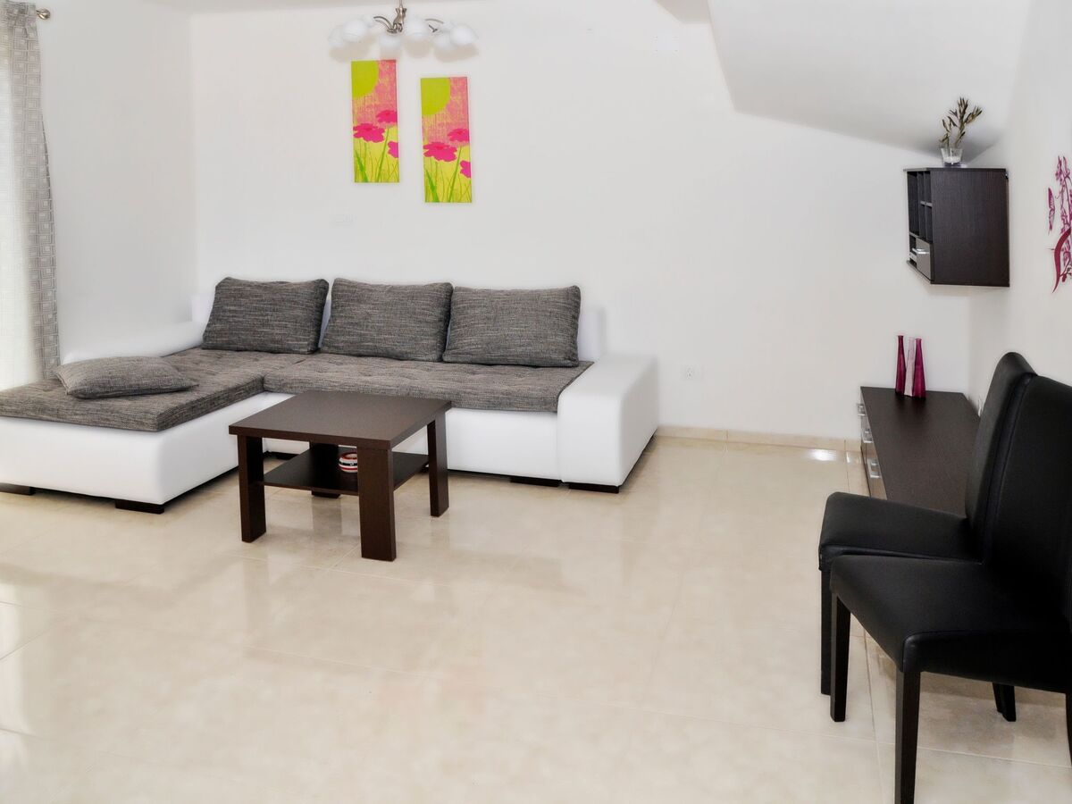 On the 70 m² ground floor you will find the living room with satellite TV and sofa bed as well as a dining table with chairs.