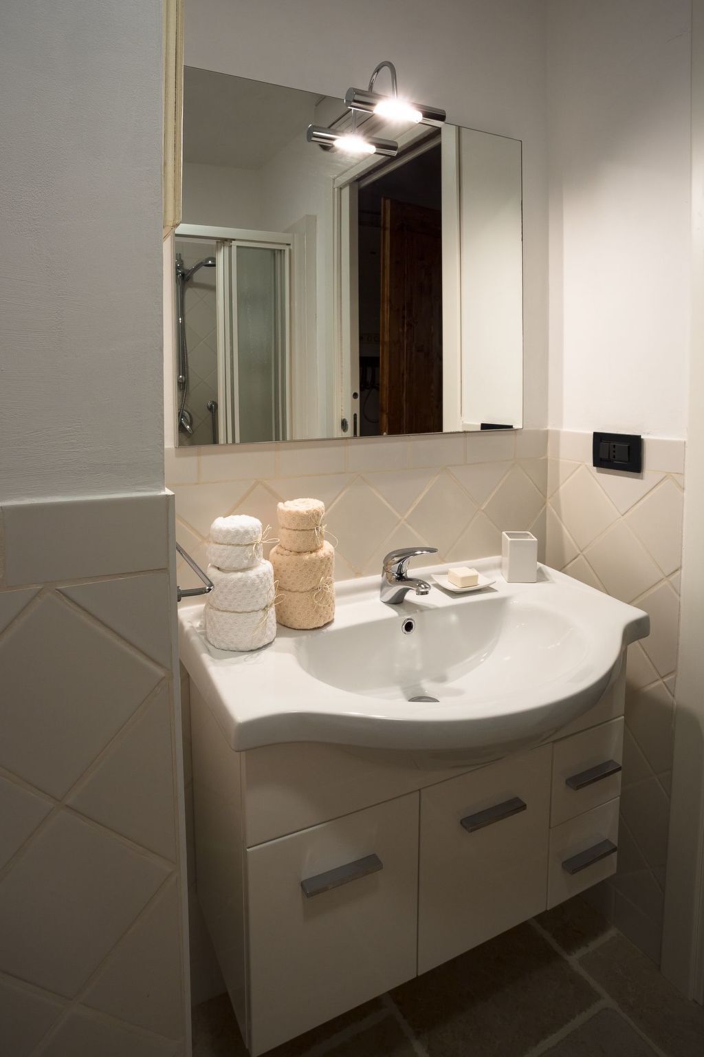 Completing the ground floor is a functional bathroom with shower, while on the first floor you will find the bedrooms and a second bathroom with bathtub.