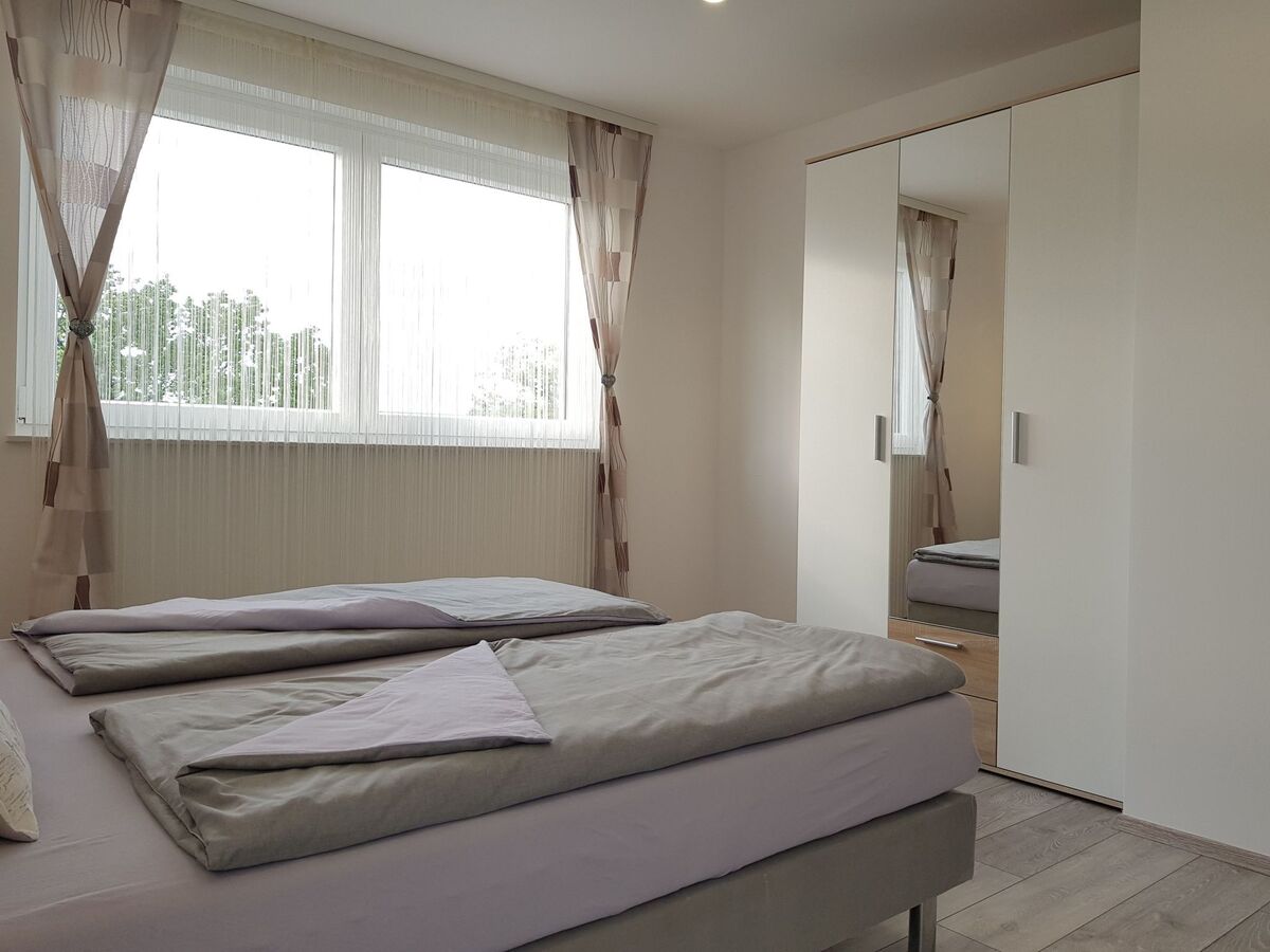 The bedroom on the ground floor has a bed measuring 160 x 200 cm, a wardrobe, two night stands.