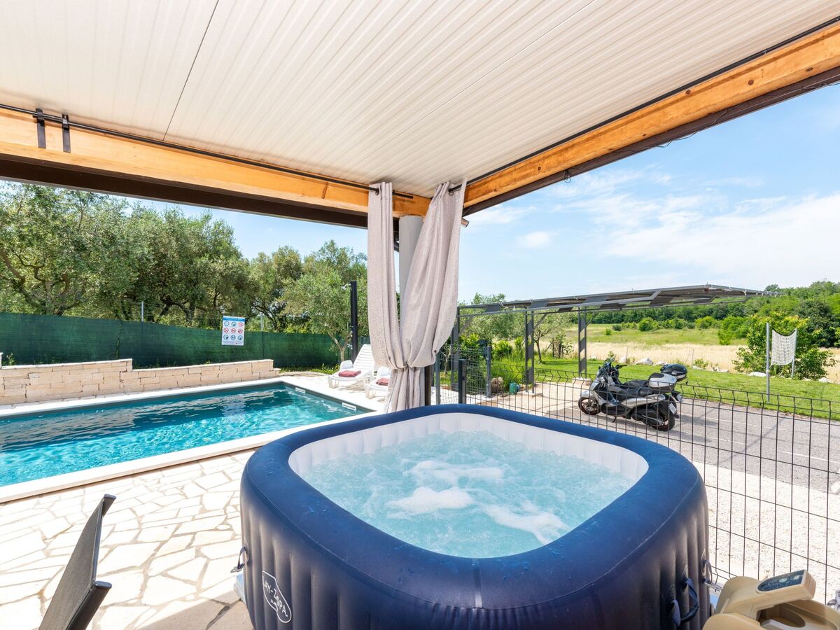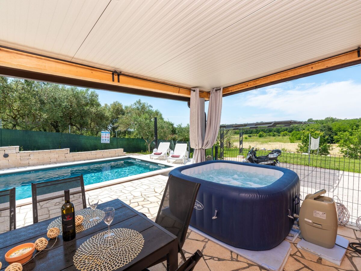 The outdoor area offers you a private garden with BBQ, a Jacuzzi, and a pool with sunbeds.