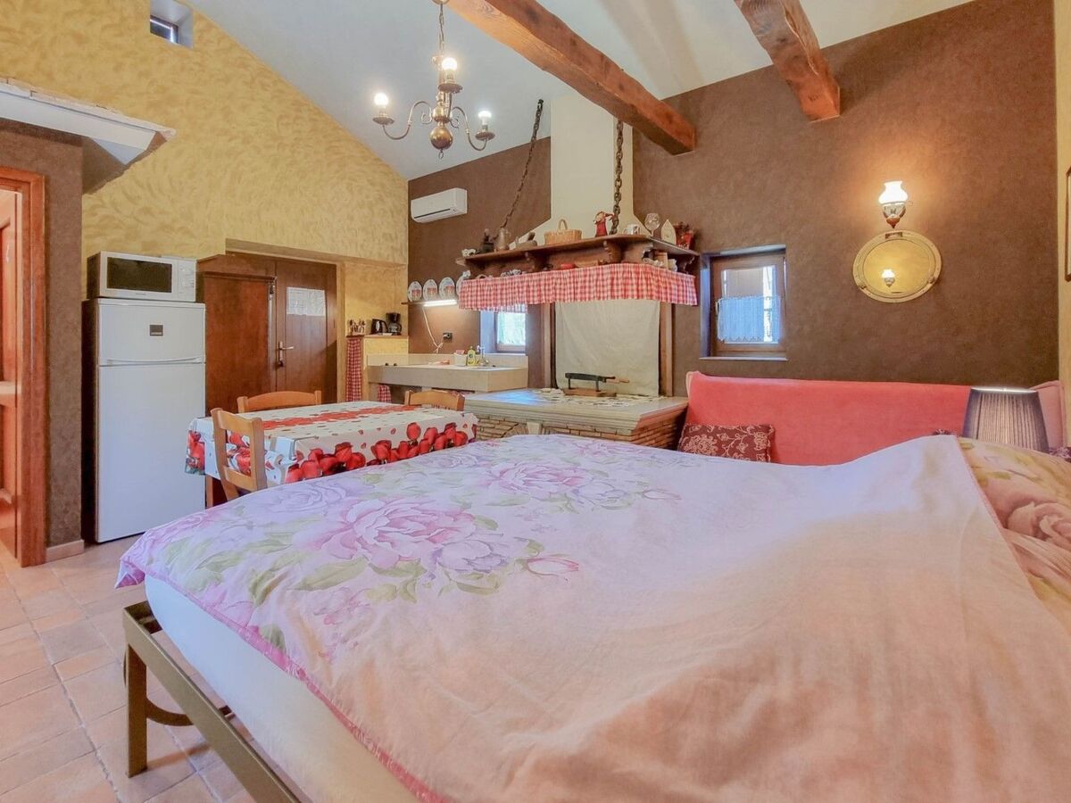 Spanning 25m2, the space is efficiently designed, featuring a comfortable double bed alongside a kitchenette area.