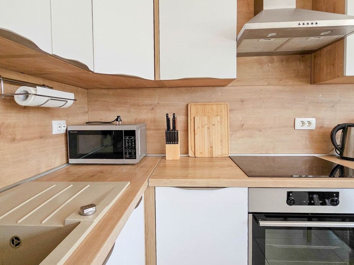 The kitchen is equipped with an electric stove, oven, refrigerator, microwave and coffee machine, providing you with everything you need to prepare delicious meals.