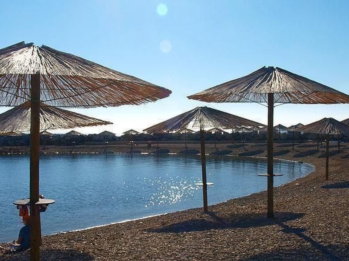 It has two bedrooms, one with a double bed (180cm wide), the other with two single beds (90cm wide).