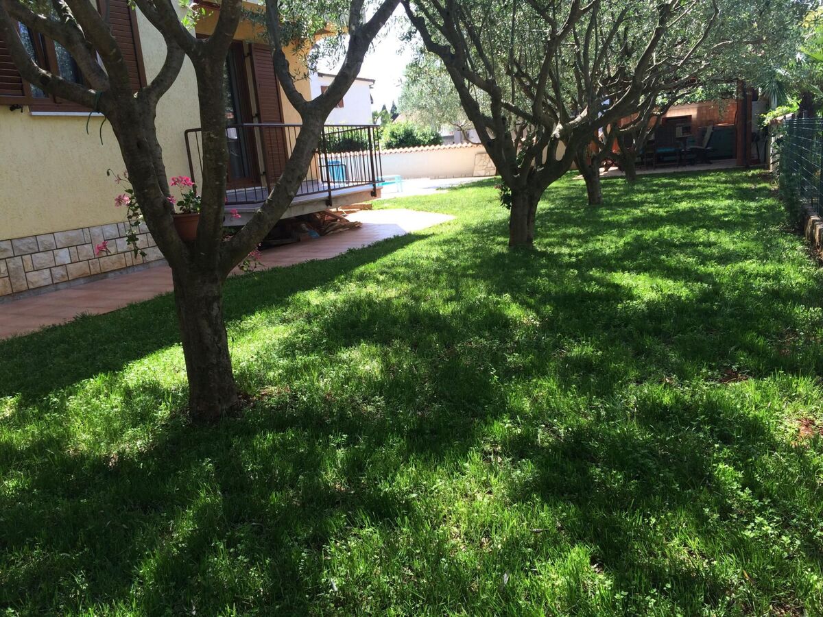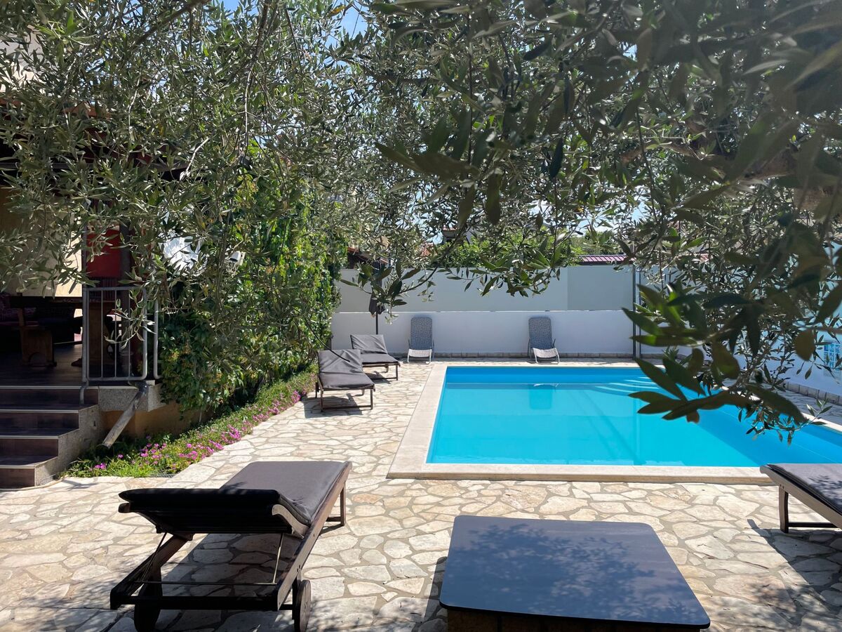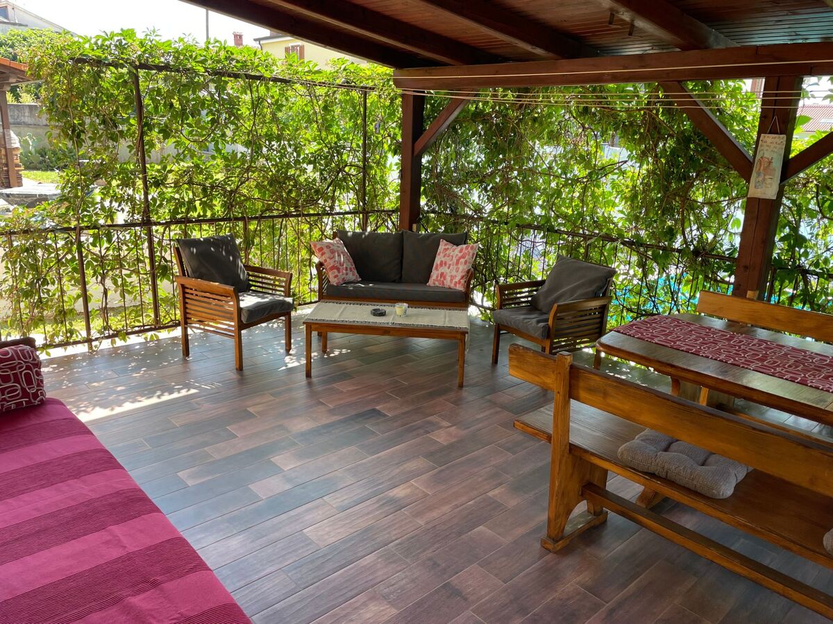 The covered terrace furnished with a table, two benches and a sofa is ideal for relaxing and enjoying a view of the garden and the sea.