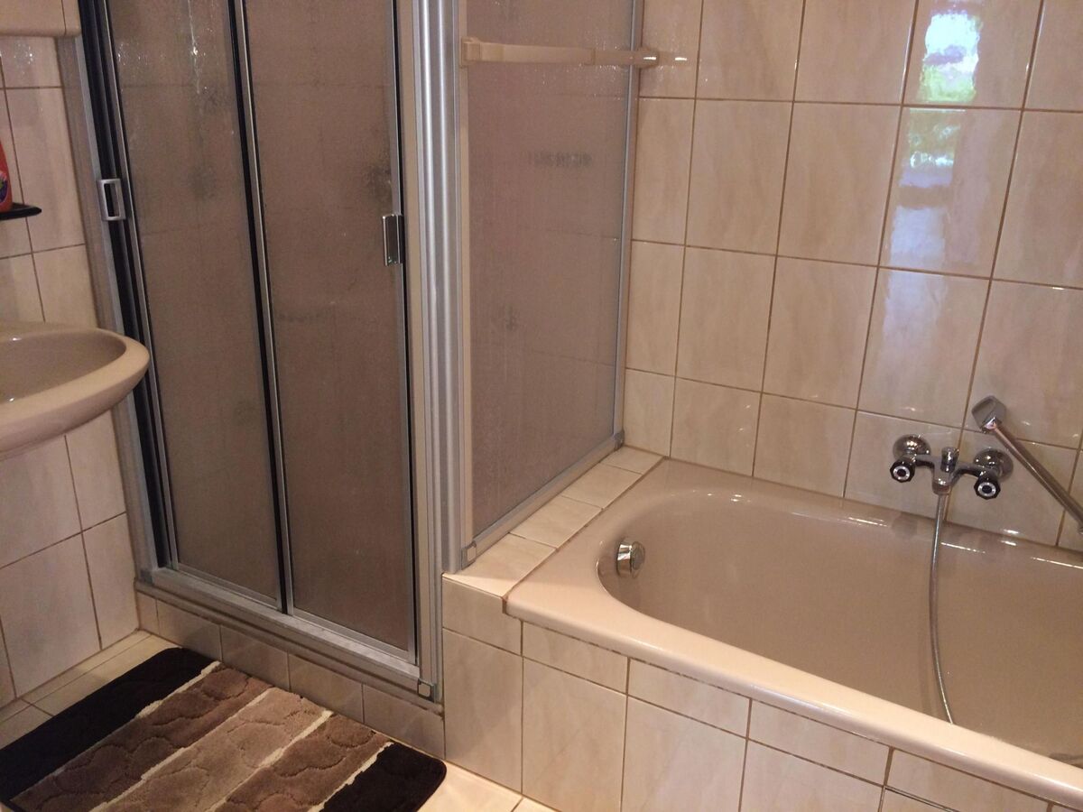 The bathroom comprises a bath, a shower, washbasins and a toilet.