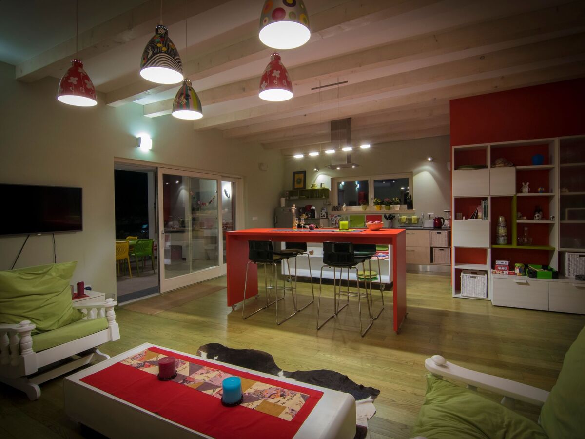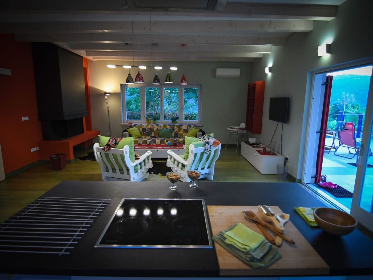 The living room opens onto the big, roofed terrace with an additional outdoor kitchen, with a sink, fridge, brick-built grill and table with chairs.