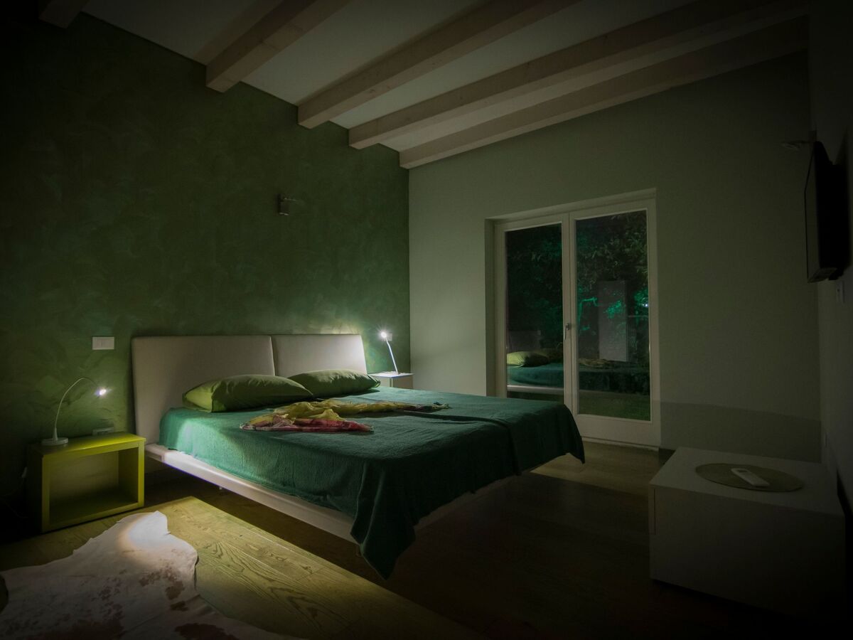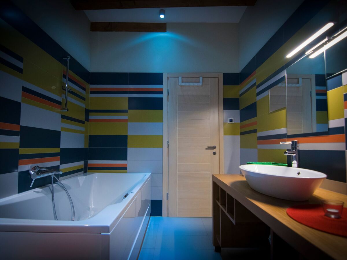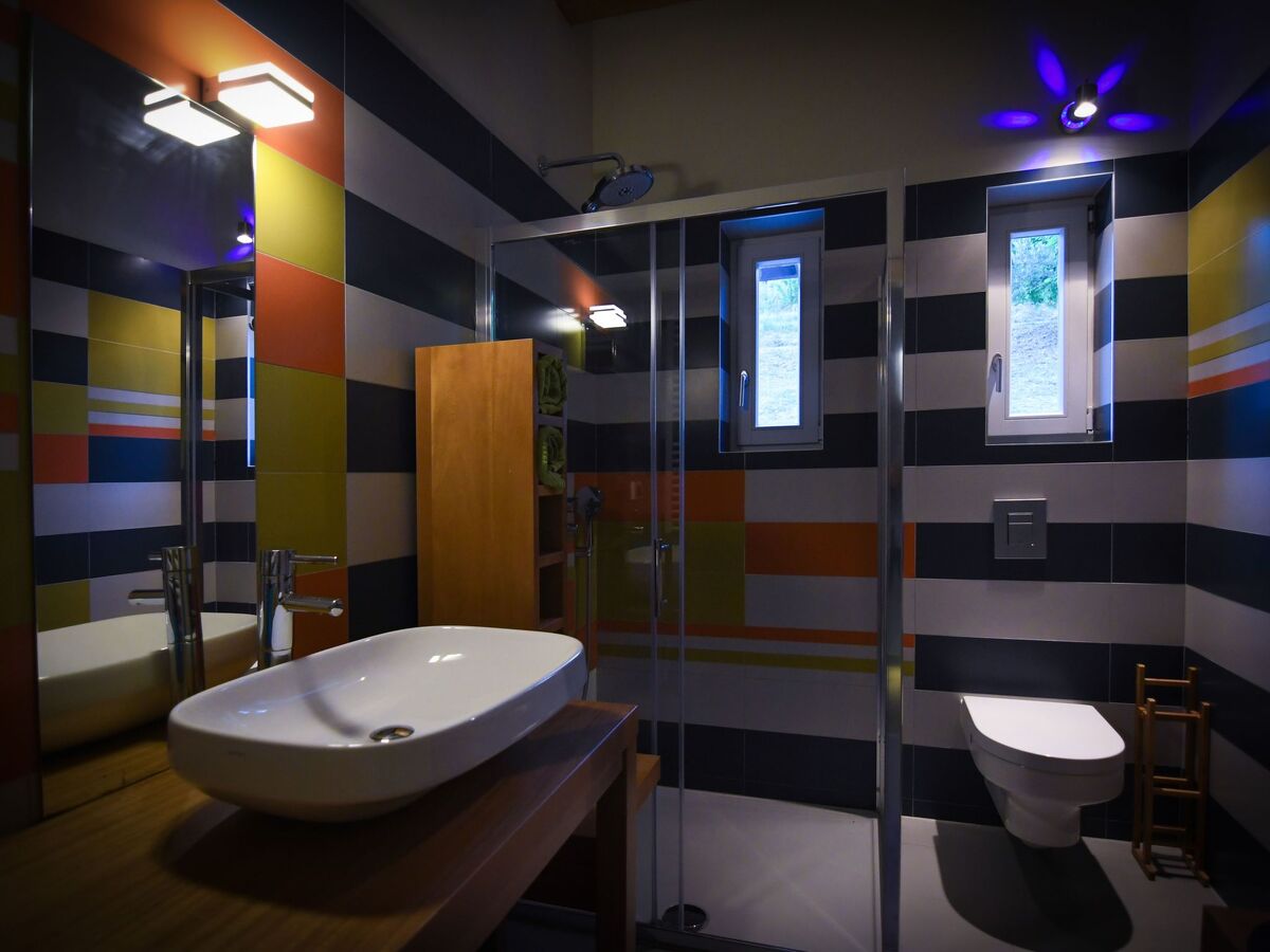 The villa with LED lighting has two bedrooms, each with a big double bed (180 x 200cm), as well as its own bathroom with a towel radiator, WC and shower, as well as a bath.