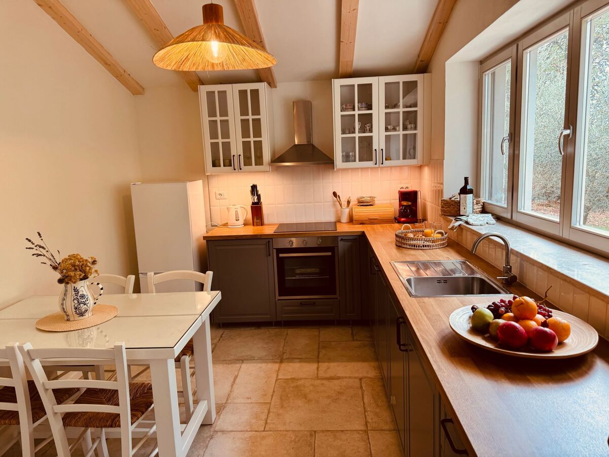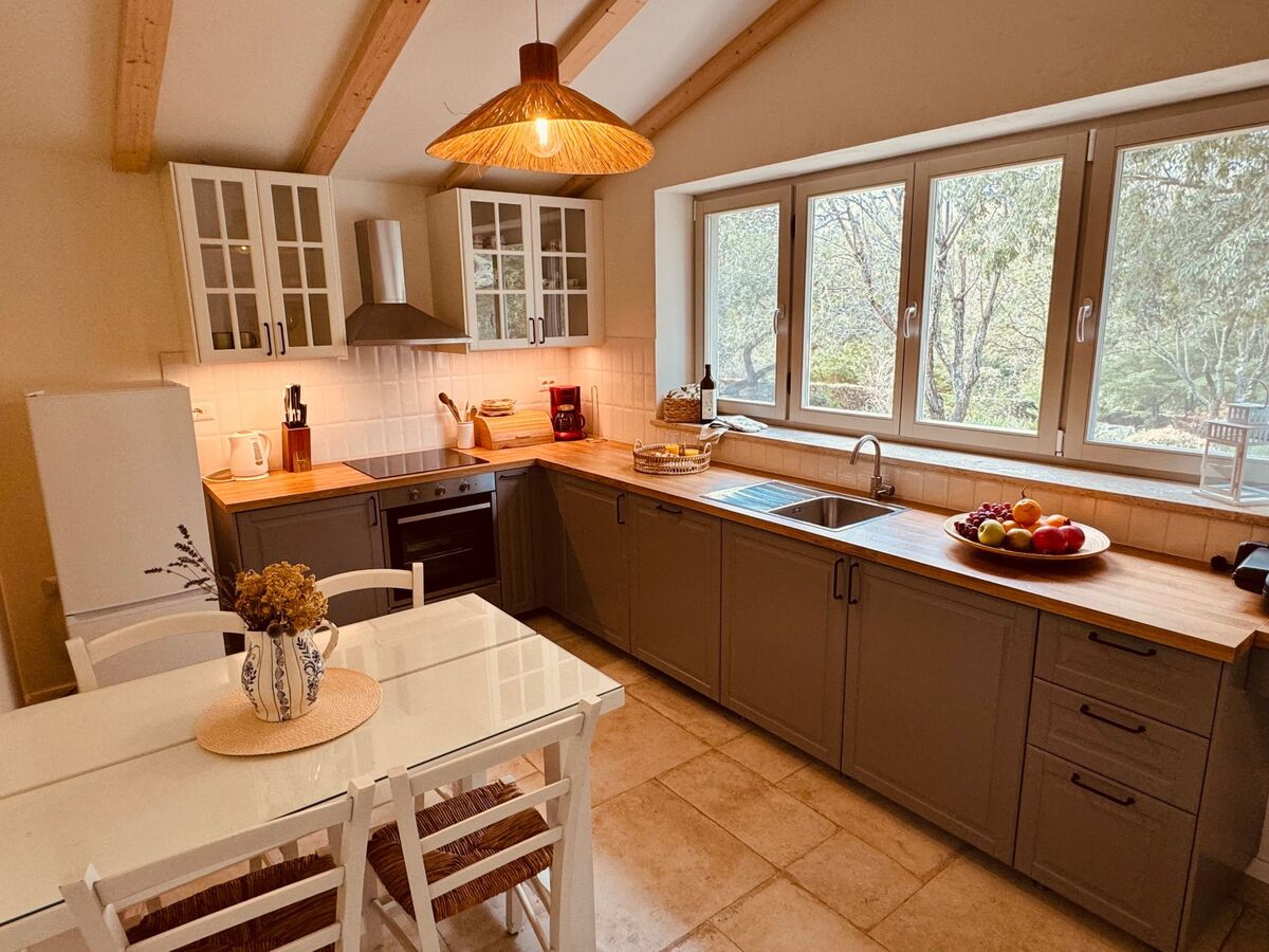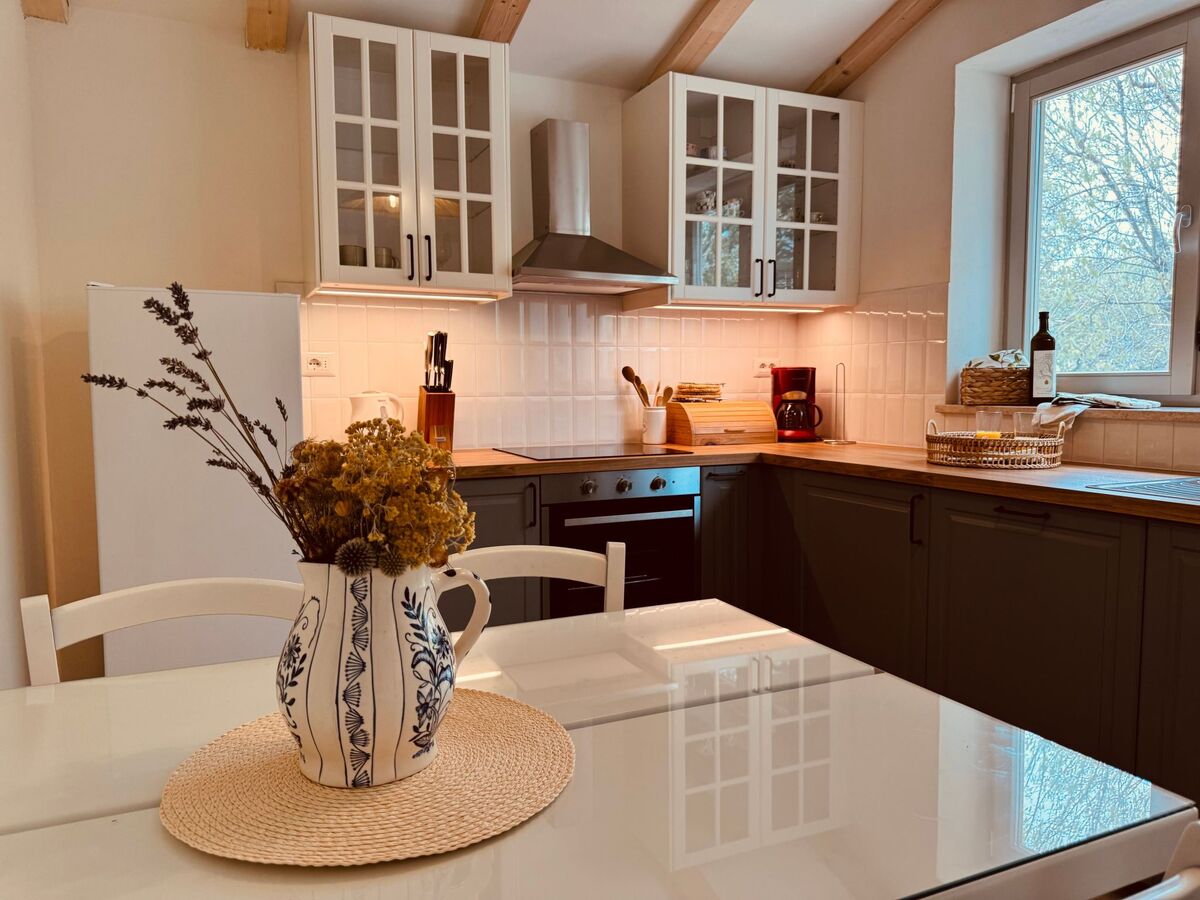 The kitchen is fully-equipped with a stove, oven, dishwasher, fridge-freezer, toaster, coffee machine and washing machine, as well as a dining table with chairs.