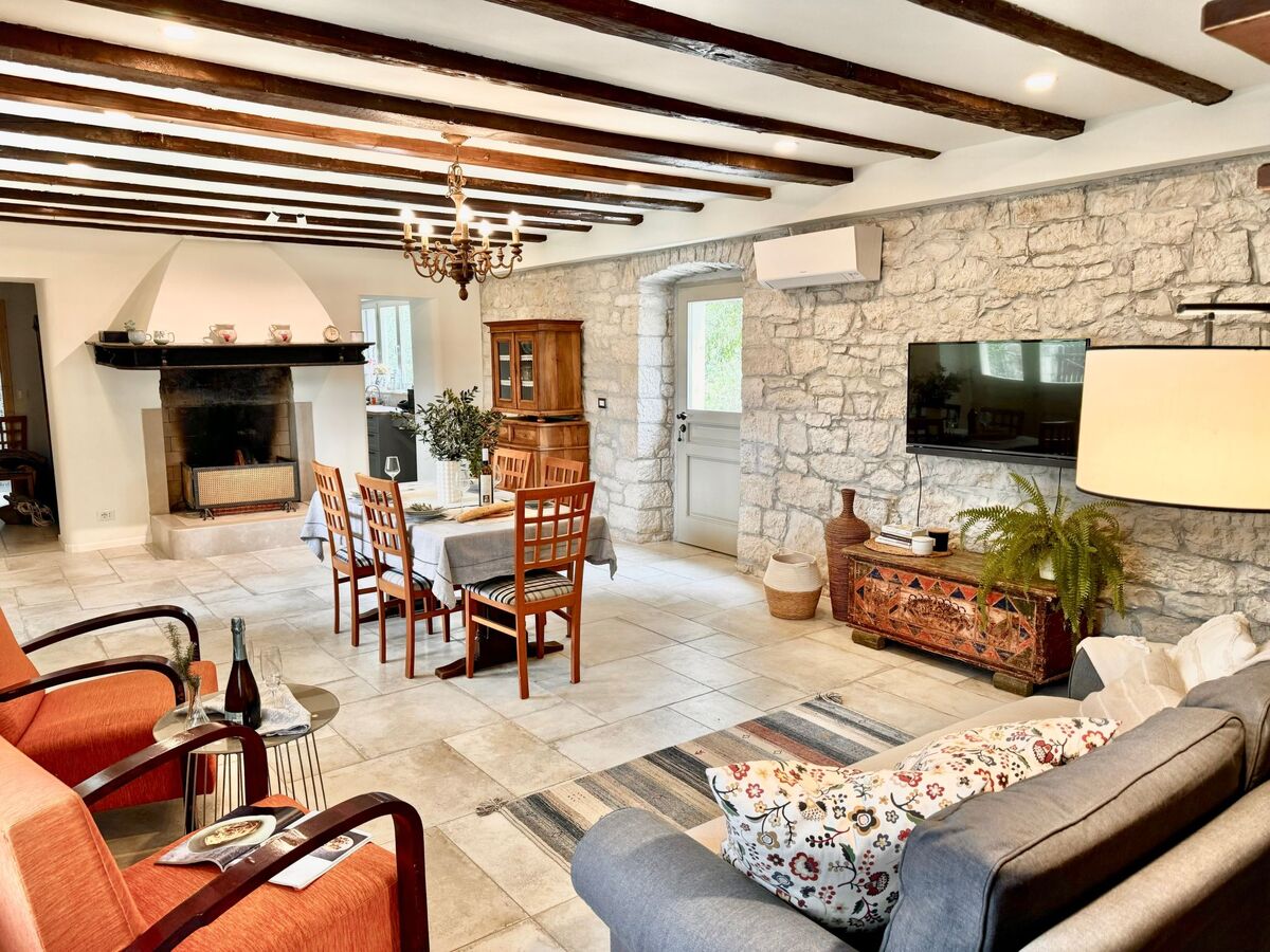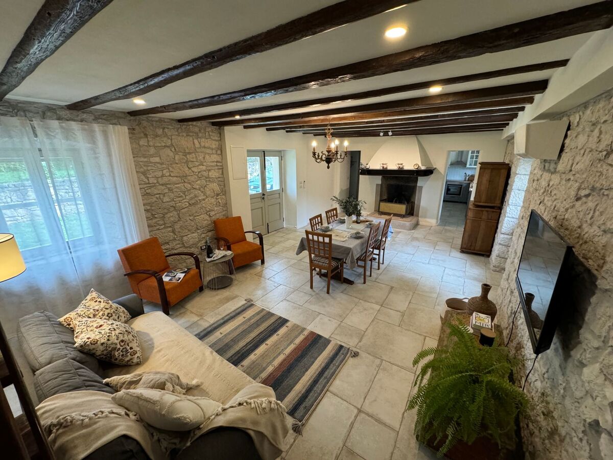 The living room provides a sofa, two armchairs and a stone fireplace.