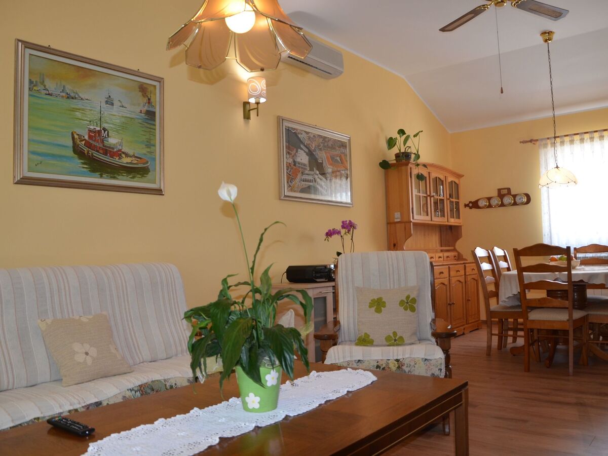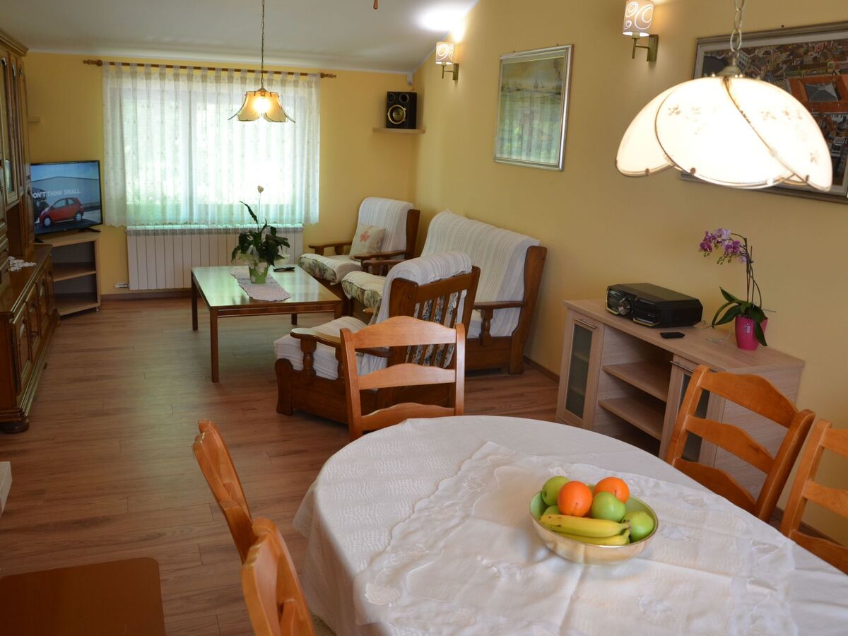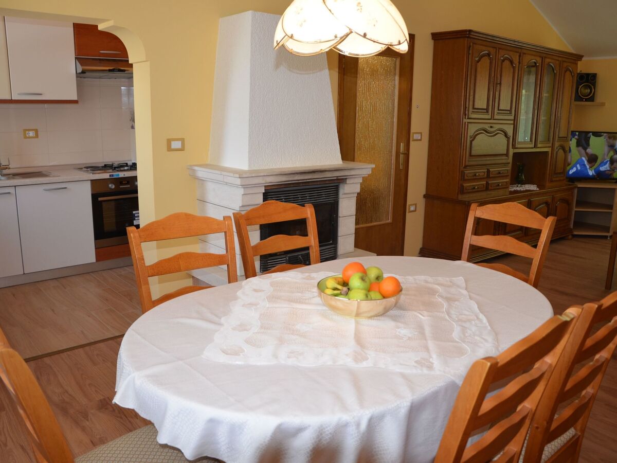The 90m² living space of the villa provides a spacious living and dining room with a sofa suite, satellite TV, a fireplace and a dining table with chairs.