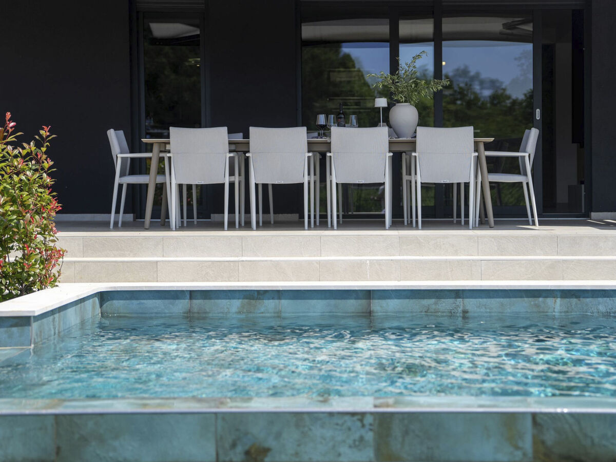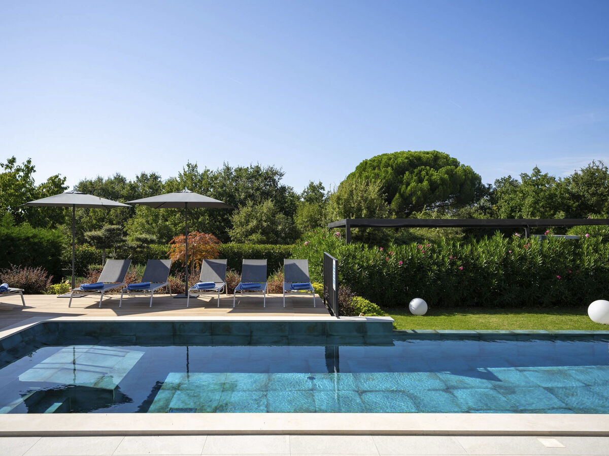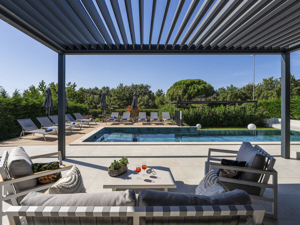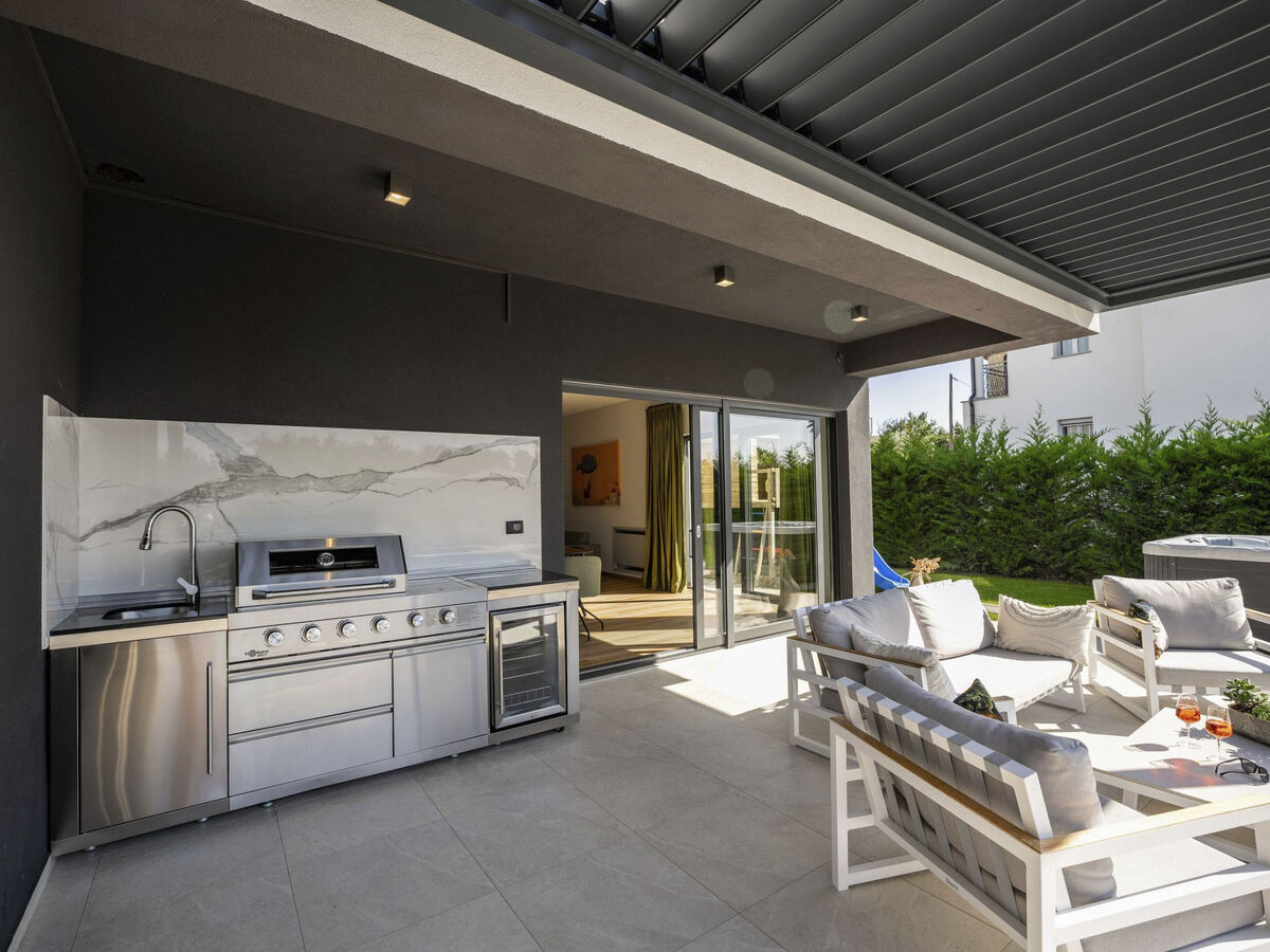 On the fenced and well-kept plot of 950 m² there is a 40 m² infinity pool with a hydromassage corner, jacuzzi, 10 sun loungers, three parasols, an outdoor kitchen with gas barbecue and fridge, a covered terrace with seating and a dining table, children's playground, table tennis and 3 parking spaces.